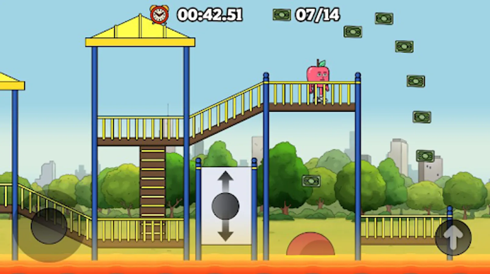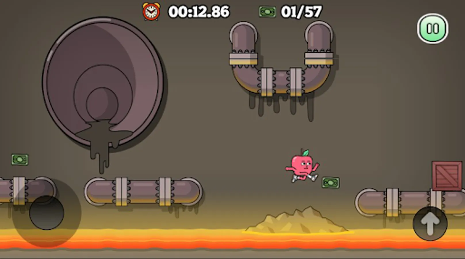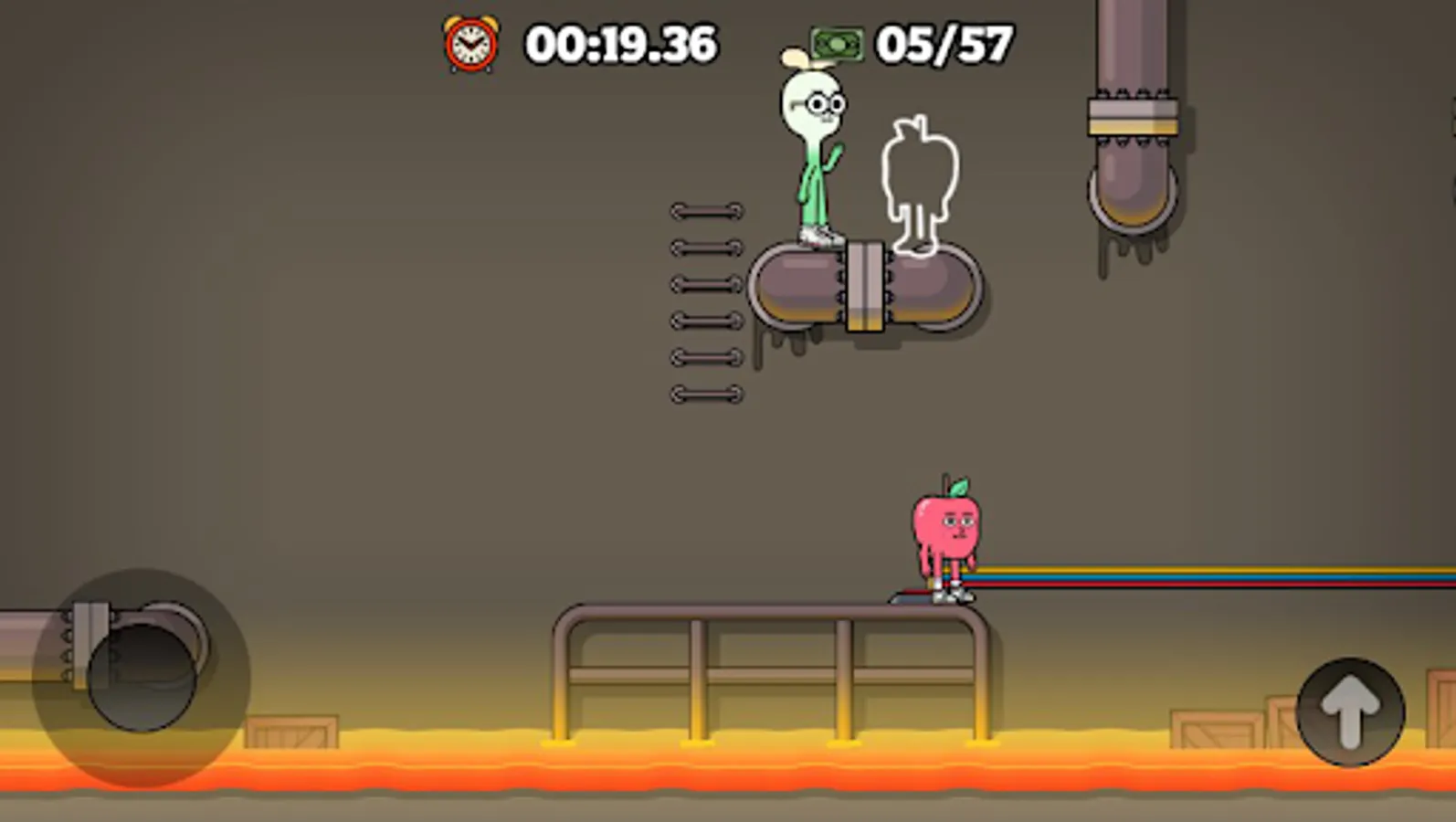 Apple, though short, can push heavy objects like boxes. He is smart enough to throw them into the lava and use them as mini islands to jump on. He cannot jump very high, but at least he uses its height as an advantage!