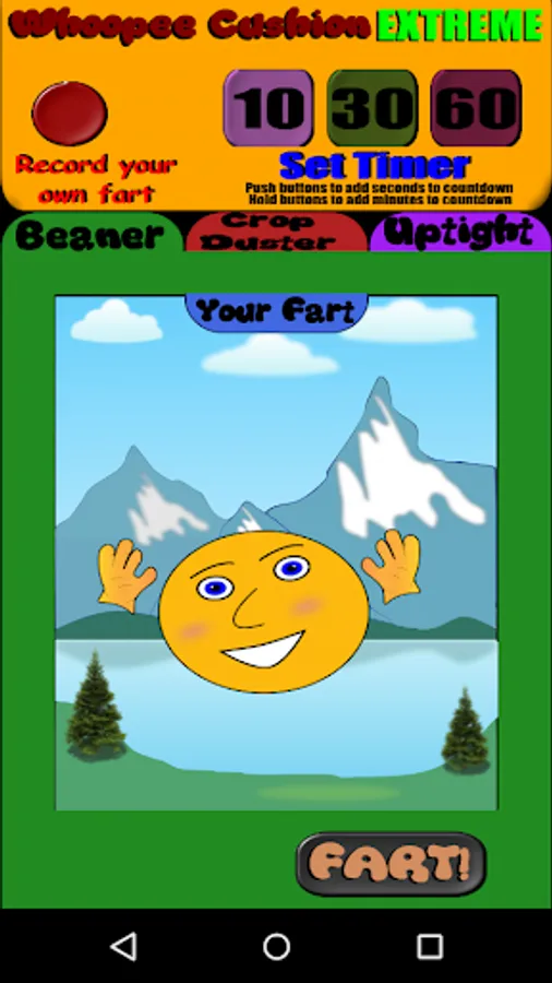 Relive the humour of yesteryear with the digital Whoopee cushion. Watch Fartso the Flatulent as he expels his noxious gas in a picturesque scene