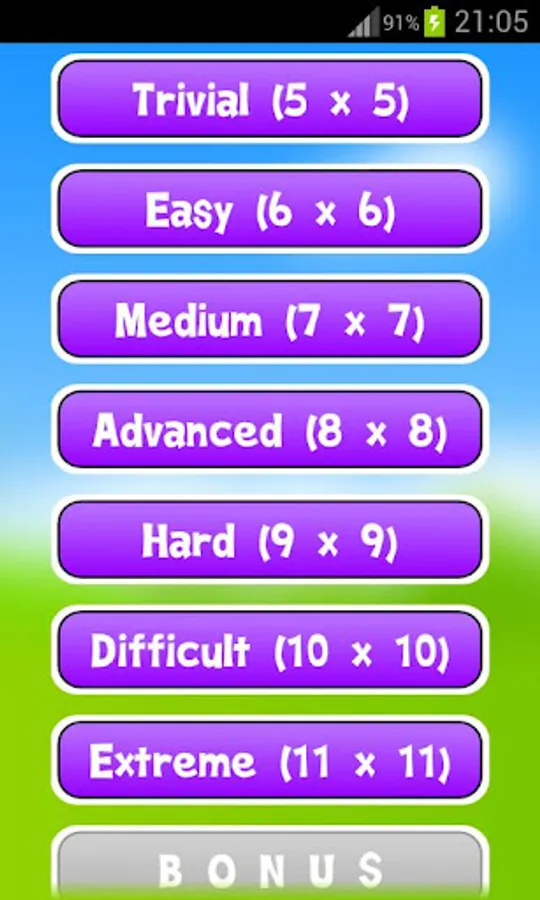 The game includes 190 boards on 7 difficulty levels, from easy to very difficult, and a range of different game board sizes. A non-regular bonus level is also available.