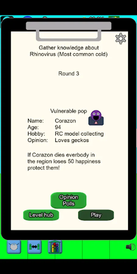 Everything is tethered to real world disease characteristics and social effects creating a simulation of an outbreak in a match 3 format.