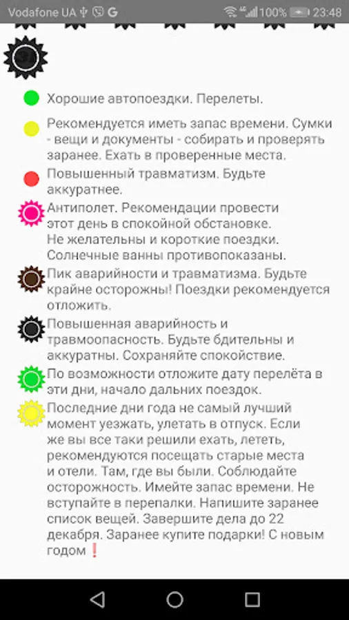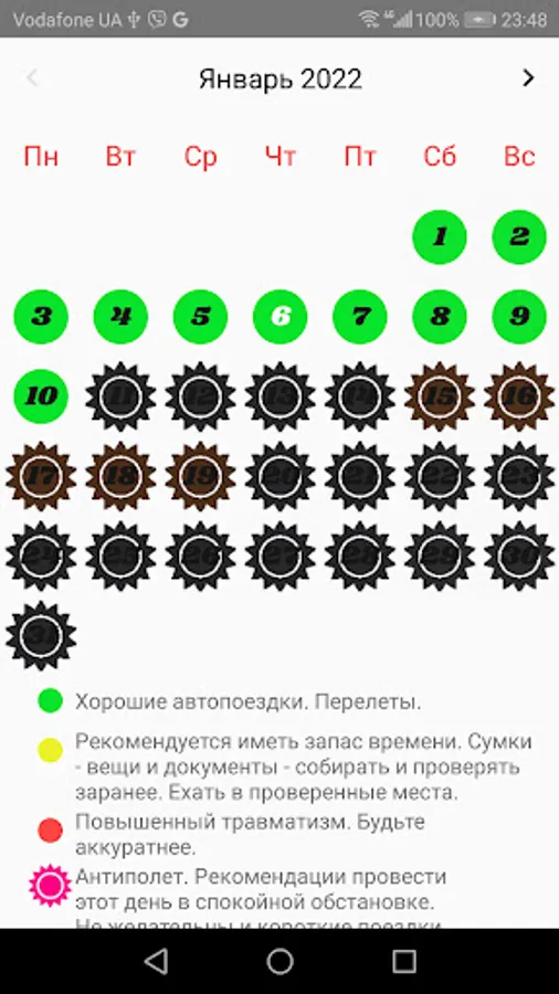 Наше приложение поможет Вам выбрать наиболее безопасный период для отдыха и путешествий! Избежать форс мажора! Не стать заложником внешних обстоятельств! В календаре указаны периоды наиболее опасные и травматичные для путешествий. Затем, дни, которые мы обозначили, как Анти-полет. Также вы найдёте здесь целые периоды, когда путешествие на автомобиле будет лёгким и удачным! Время для отпуска с детьми. Рекомендации, когда и какие страны посещать, чтобы от путешествия остались приятные воспоминания.