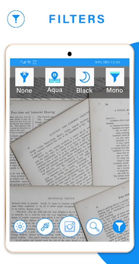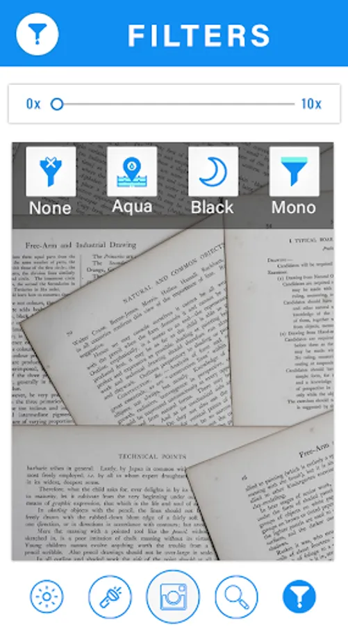 Magnifying camera glass has 4 color modes i.e. None, Aqua, Black, and Mono.