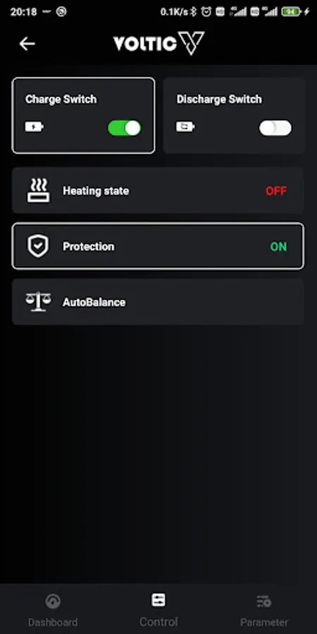 3) Provides interactive functions on the "Control" tab including: Charge Switch, Discharge Switch, Heating state, Protection and AutoBalance.
