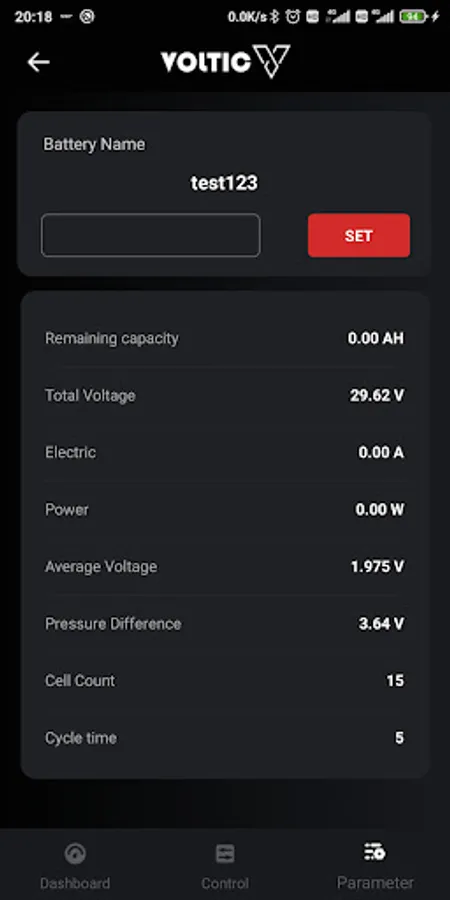 4) The "Parameter" tab include current Bluetooth name, Remaining capacity and some other parameters.