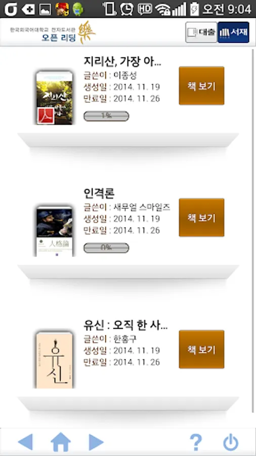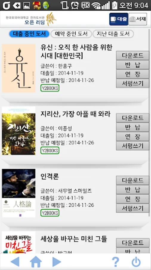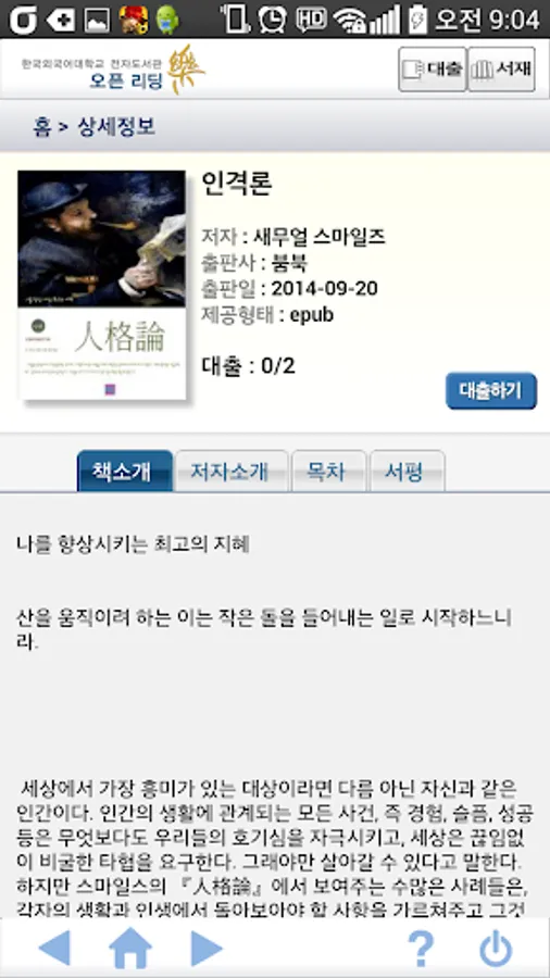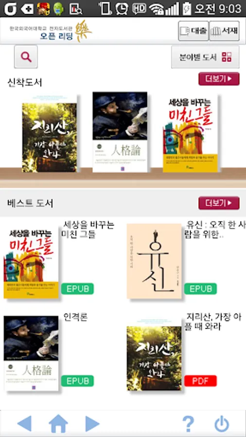 Korea University of Foreign Studies e-Library e-book lending members to provide services to the target authenticates the user. Search ebooks, lending by reading through the smartphone anytime, anywhere is possible.
