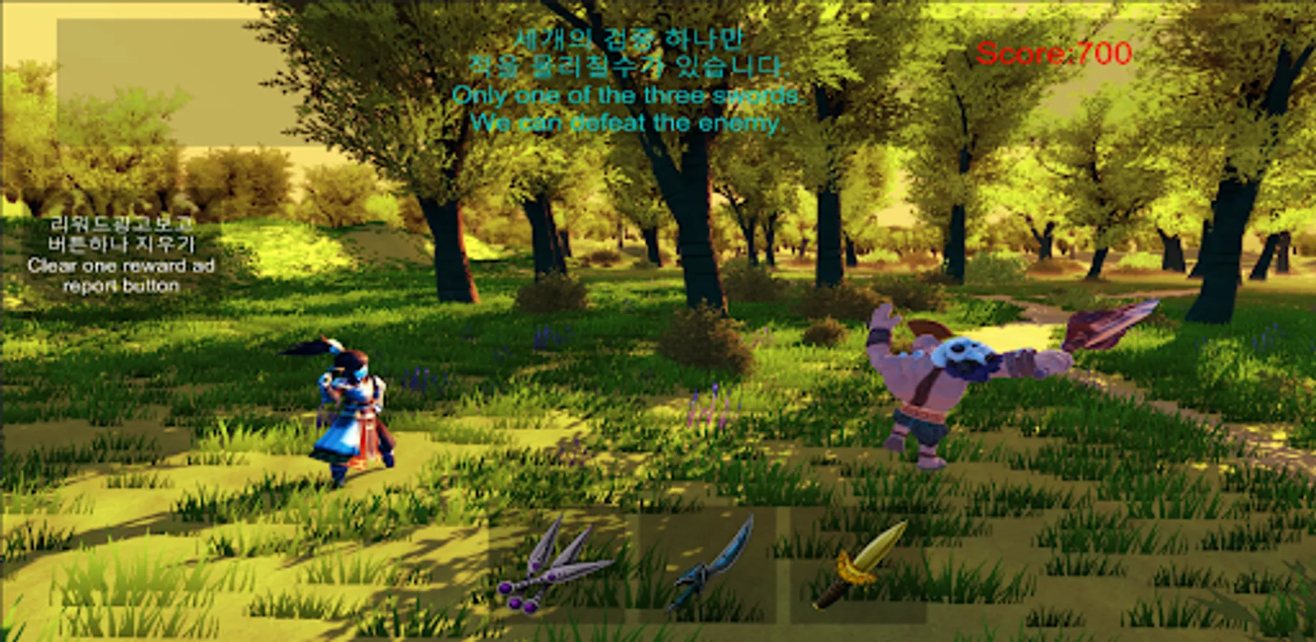 검 세 개 중에 한개를 선택해서 몬스터를 물리치시오.