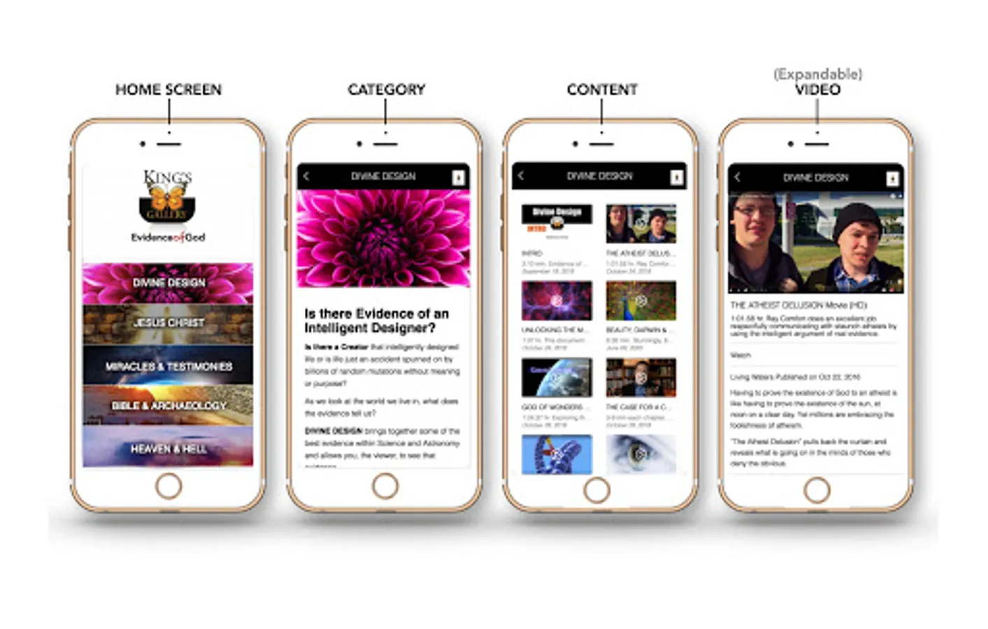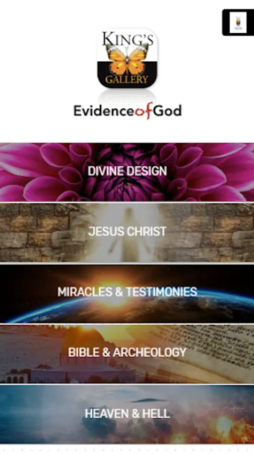 The easiest way to see and share the best evidence of God. Freely accessible within a personal app, this makes sharing God easy! For all truth seekers. The collective, clear display of evidence in 5 powerful categories becomes the doorway to confident faith in Christ and the pathway to real Hope and True Love. King's Gallery is simply the stage where the glory of God is the star! A growing archive of the best documentaries, testimonies and easy to understand teachings that educate, inspire and bring forth a clear awareness of the best evidence available. There's nothing more compelling than seeing the real evidence which points to the One True God!