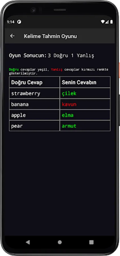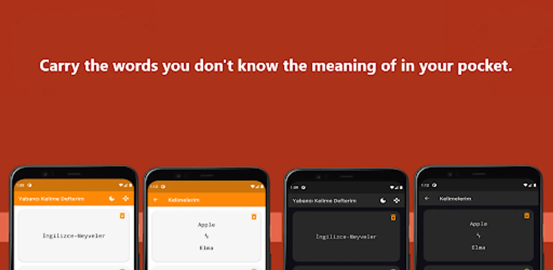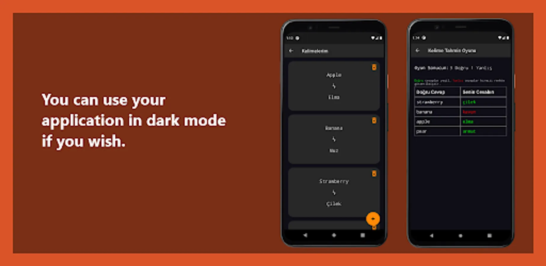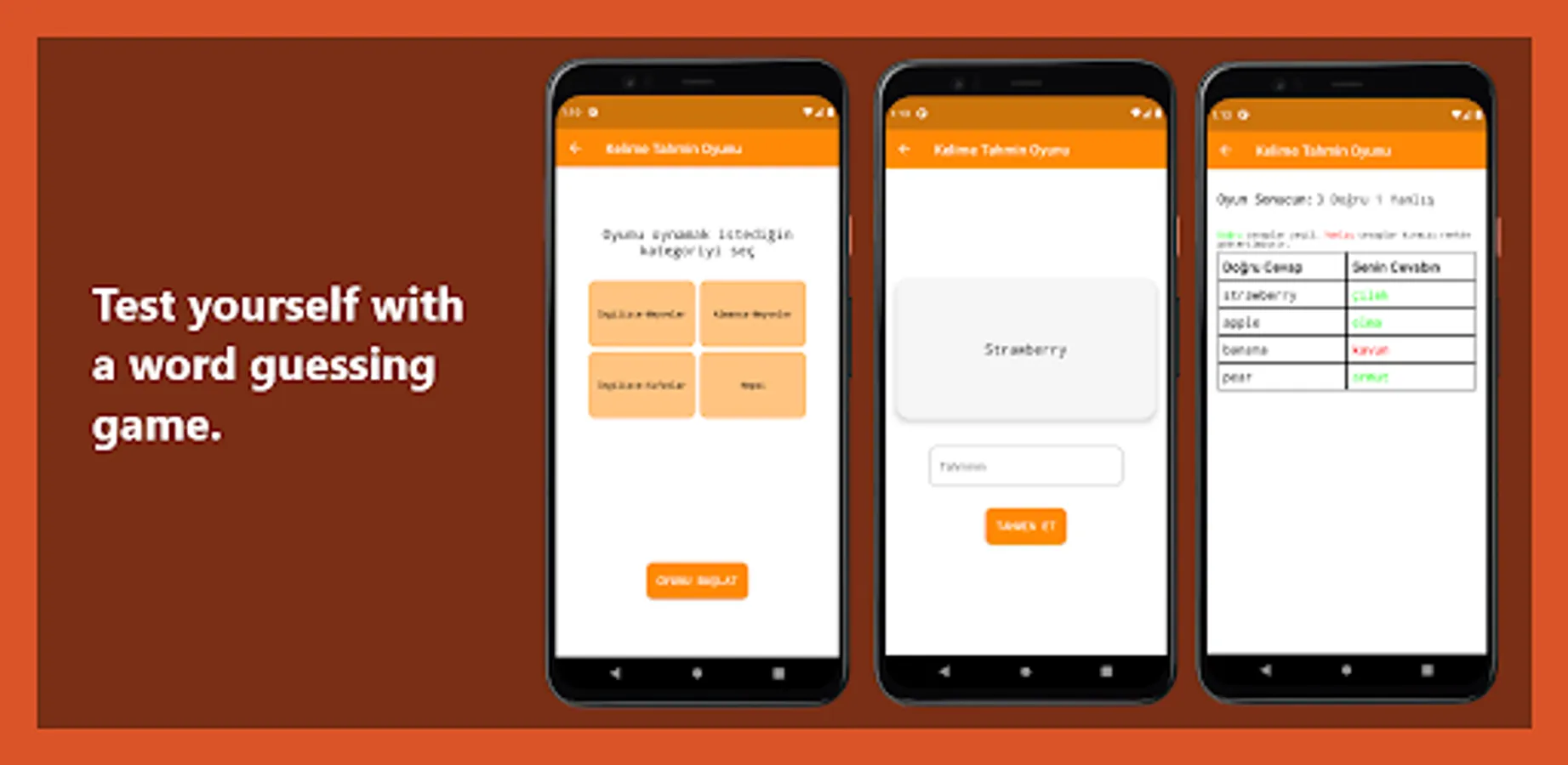 Store unfamiliar words by categorizing them. Create categories and add unfamiliar words along with their meanings to these created categories. Test yourself with a word guessing game using the words you've added. You can delete words and categories anytime you wish. Be careful when deleting a category, as deleting a category will also remove the words within it. You can use the application in either light or dark mode as you prefer.