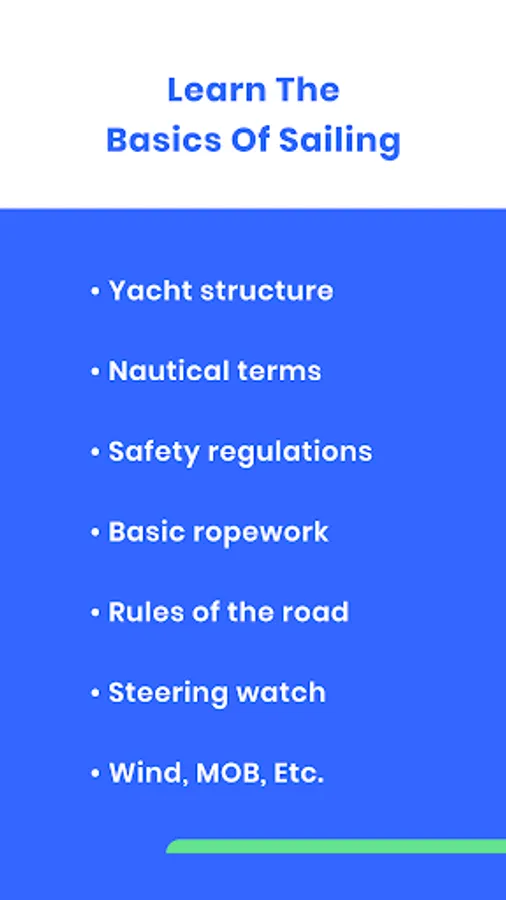 A highly understandable sailing course for beginners who want to learn the basics before moving on to practical training or being a passenger on a sailboat.