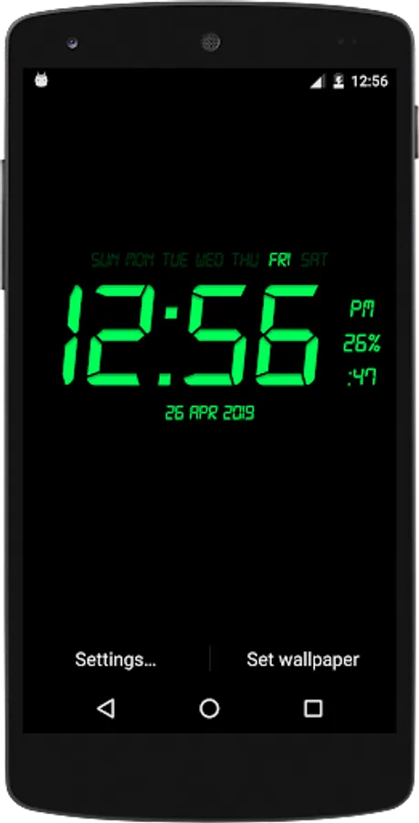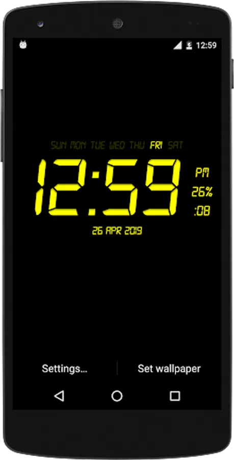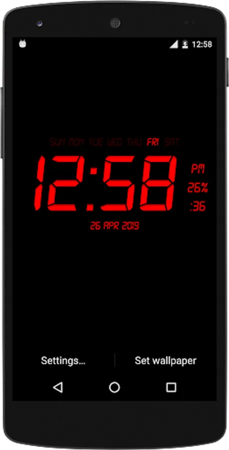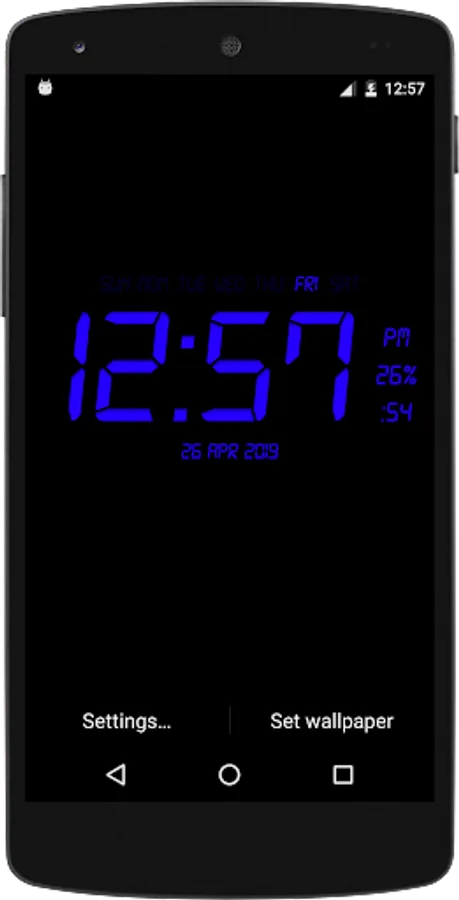 Digital Clock Live Wallpaper that displays current time, date and day of the week. All date and time formats are supported.