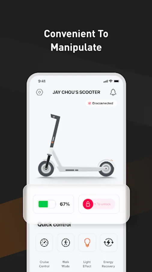 Vehicle settings: light effects, speed mode, Third level Energy recovery setting, Bluetooth remote control
