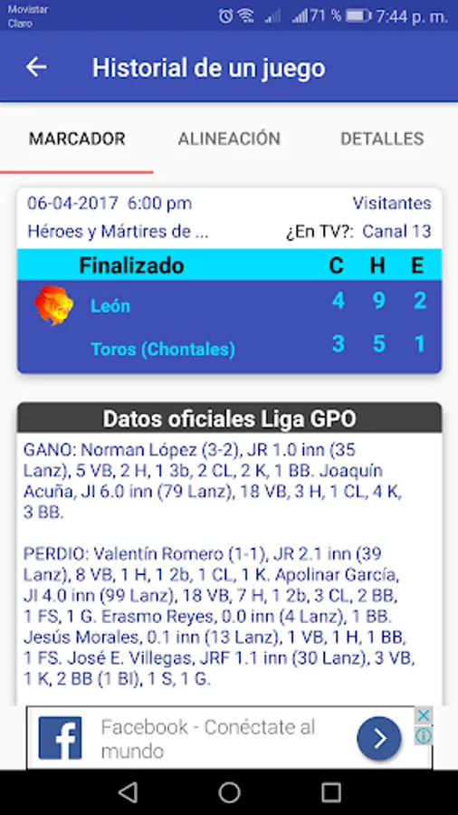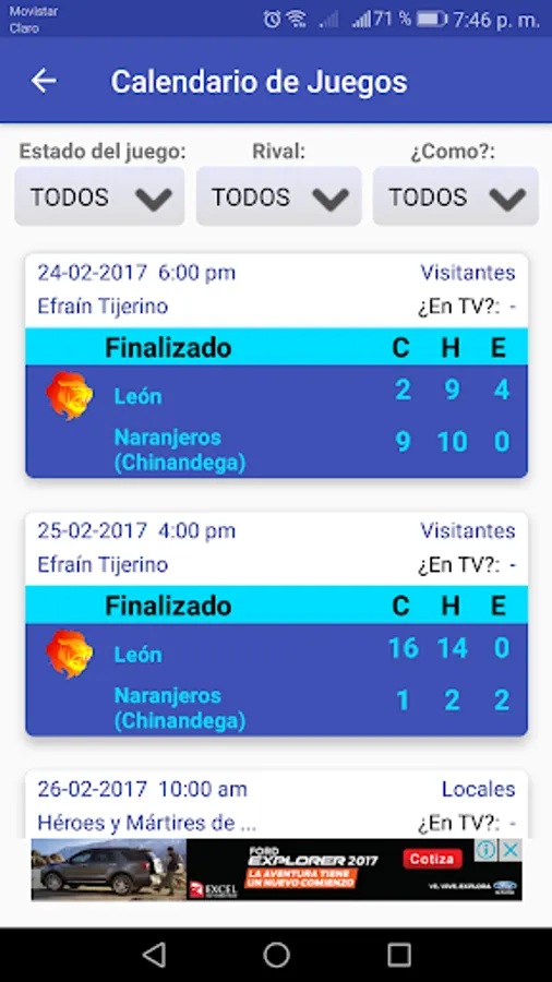 - You will be able to consult ALL the games of the León team, dates, hours, stadiums, if we play as Home or Away, you will also be able to see the results of previous games (races, hits, errors).
