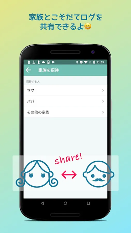 家族とこそだての記録を共有することができます。