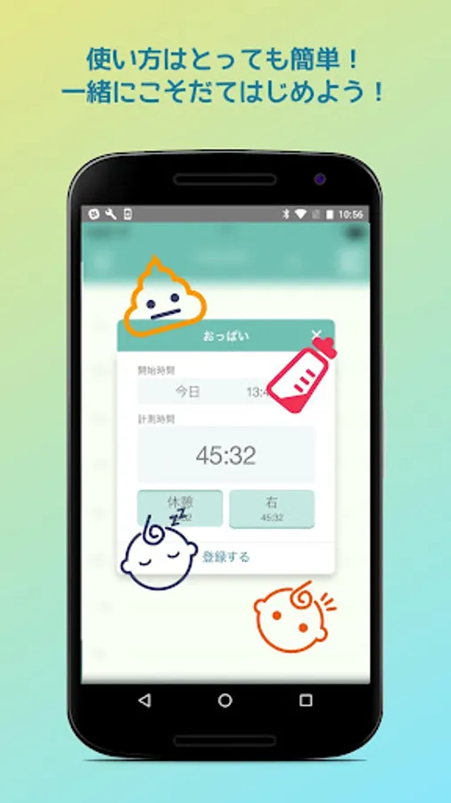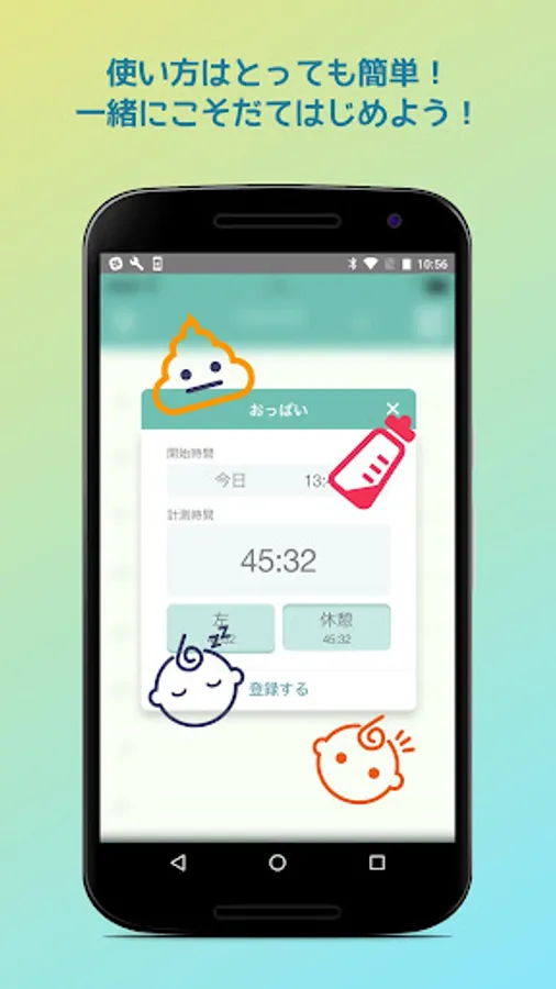 このアプリでは起動後ワンタップで、授乳タイマーのカウントアップを開始できるようにしました。煩わしい操作などは一切不要な、ママにも赤ちゃんにもやさしいアプリです。