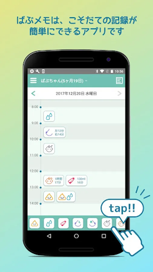 24時間のタイムラインに子育ての記録のアイコンが並ぶので1日の概要が一目でわかります。