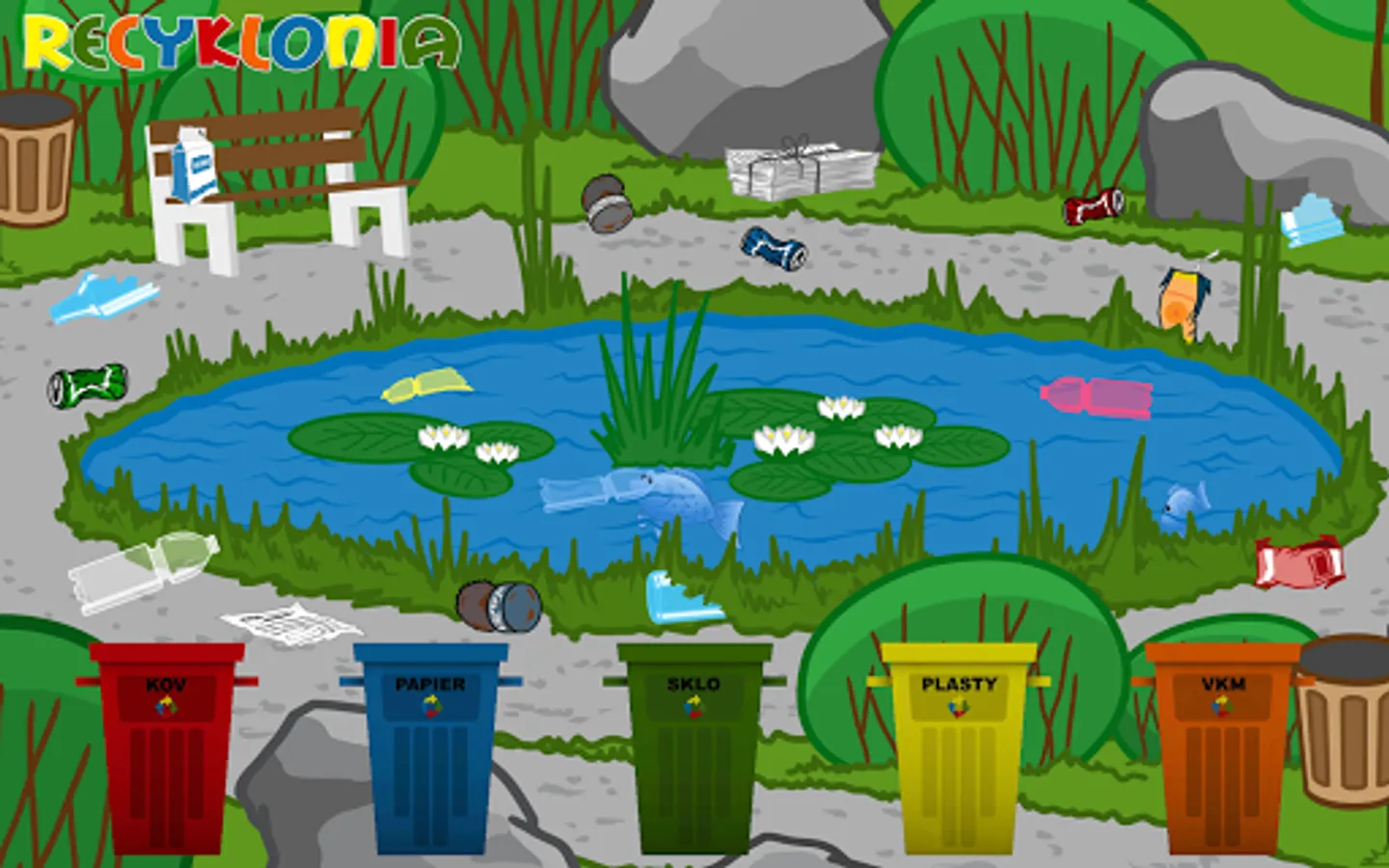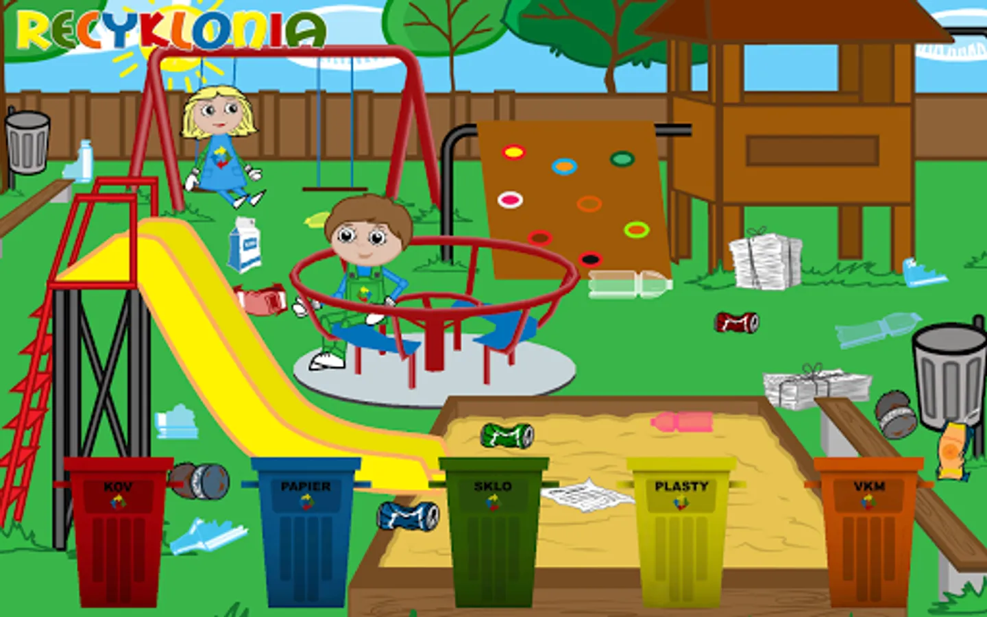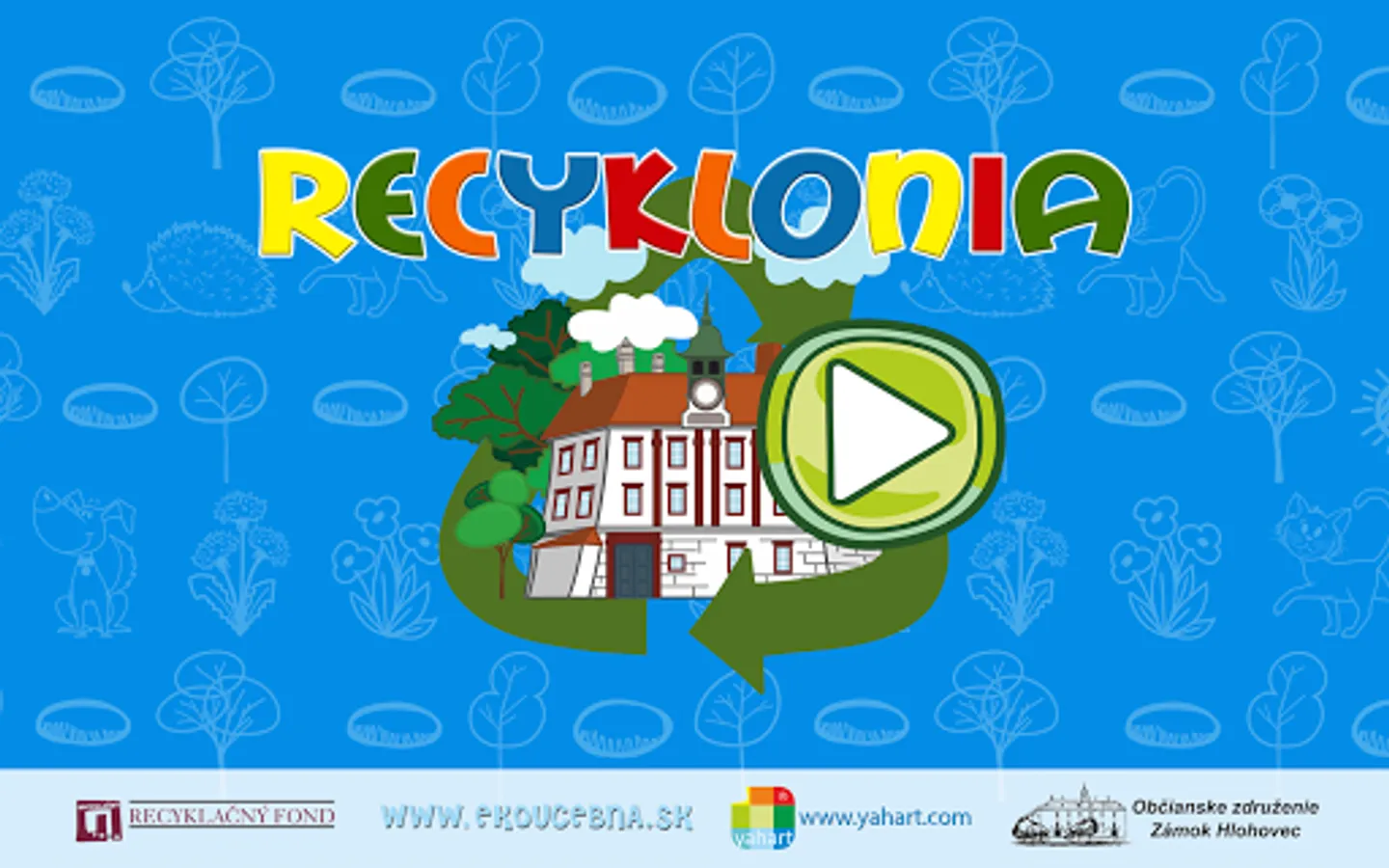 Educational game "Recyklonia" mobile touch device is intended for users of child (4-10 years). Children's user can choose from 7 environment, which will save animals, help clean the environment and correctly categorize the scattered trash, or listen to an audio recording with the latest information. They will learn how to properly sort waste, become familiar with the color distribution of separate collection and learn new information.