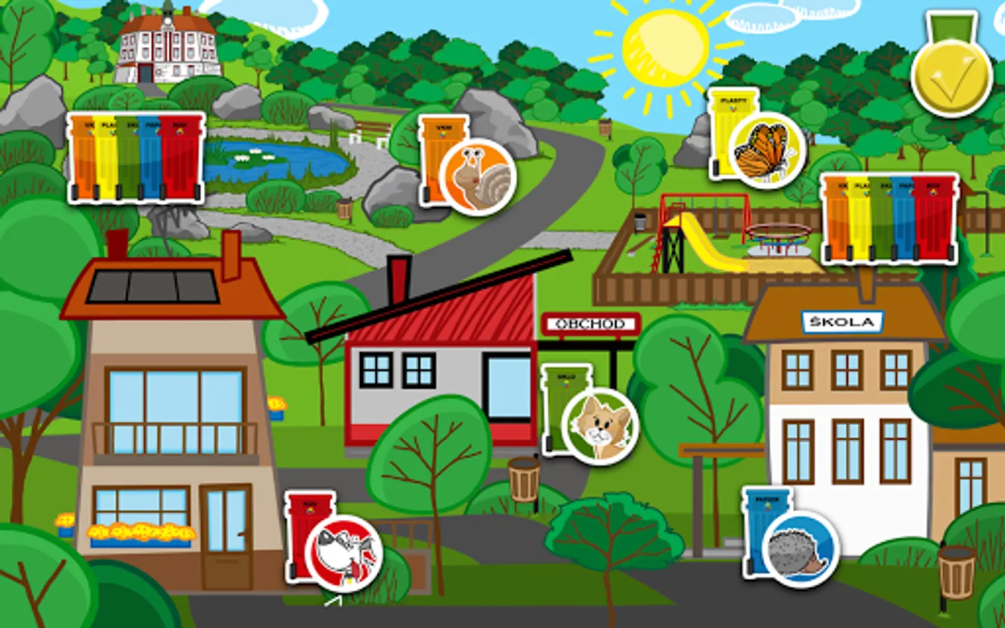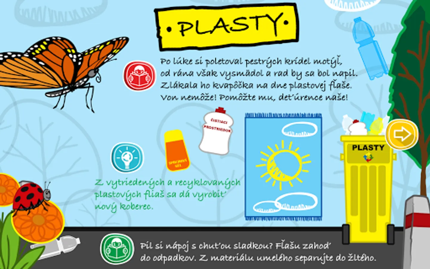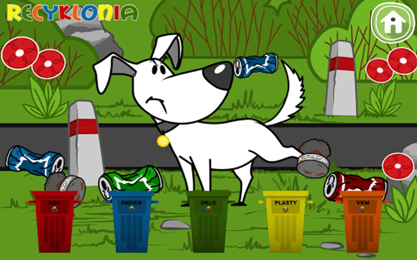 Educational game "Recyklonia" mobile touch device is intended for users of child (4-10 years). Children's user can choose from 7 environment, which will save animals, help clean the environment and correctly categorize the scattered trash, or listen to an audio recording with the latest information. They will learn how to properly sort waste, become familiar with the color distribution of separate collection and learn new information.