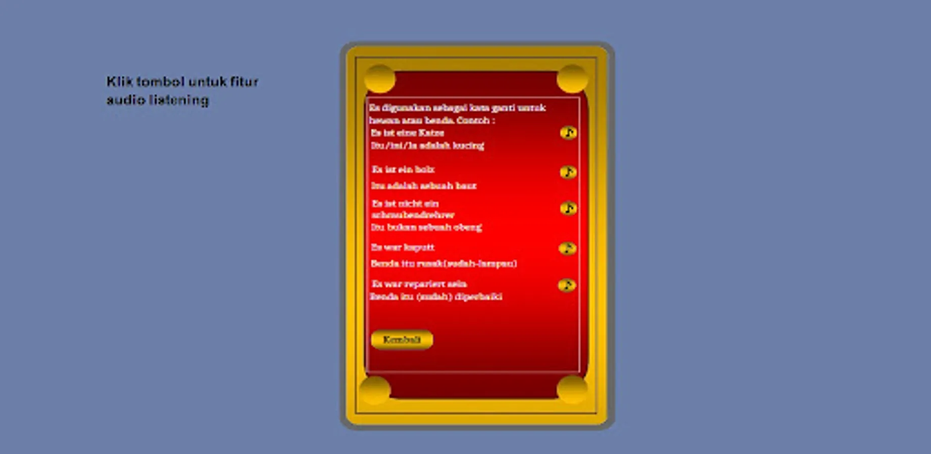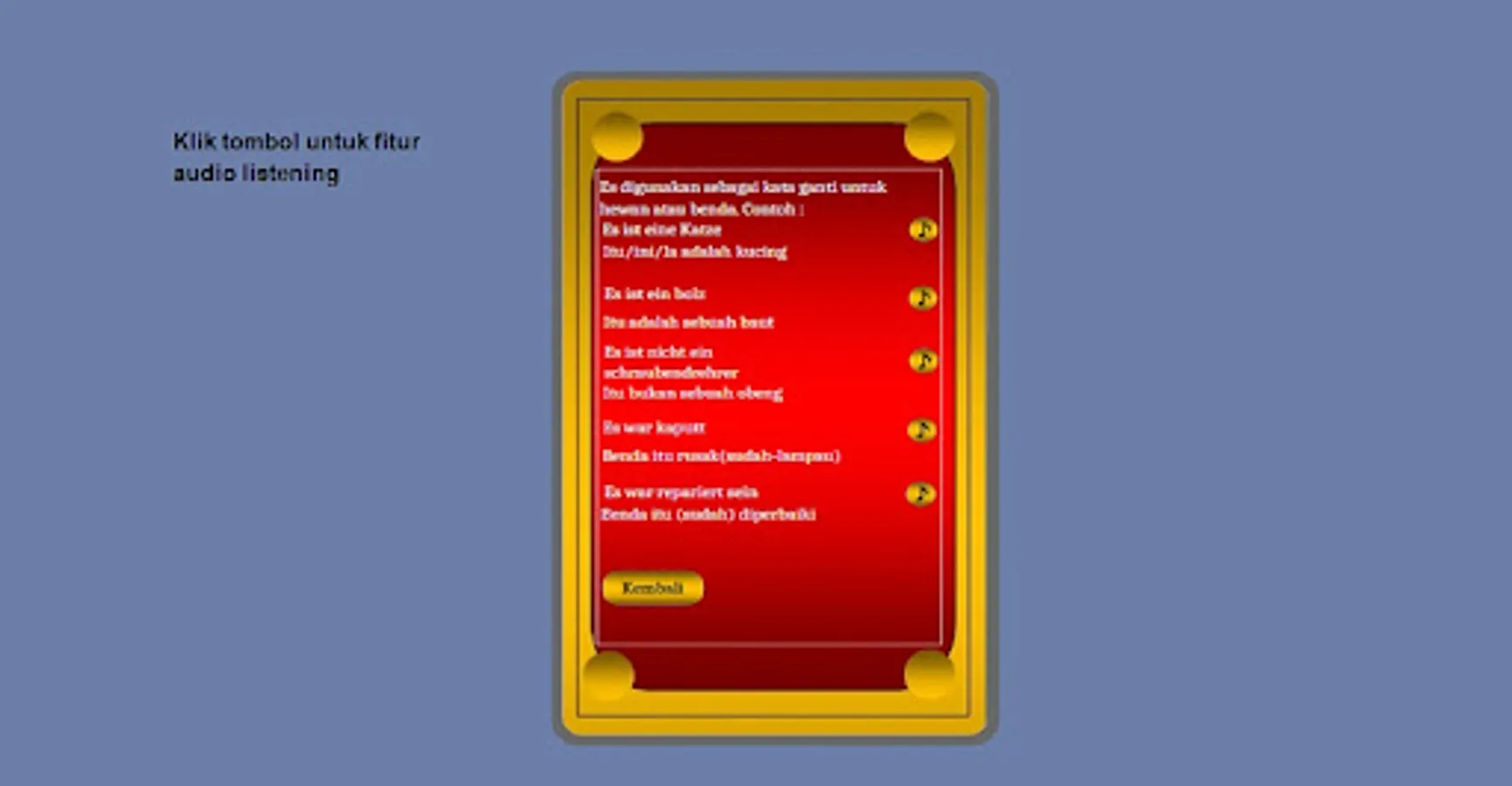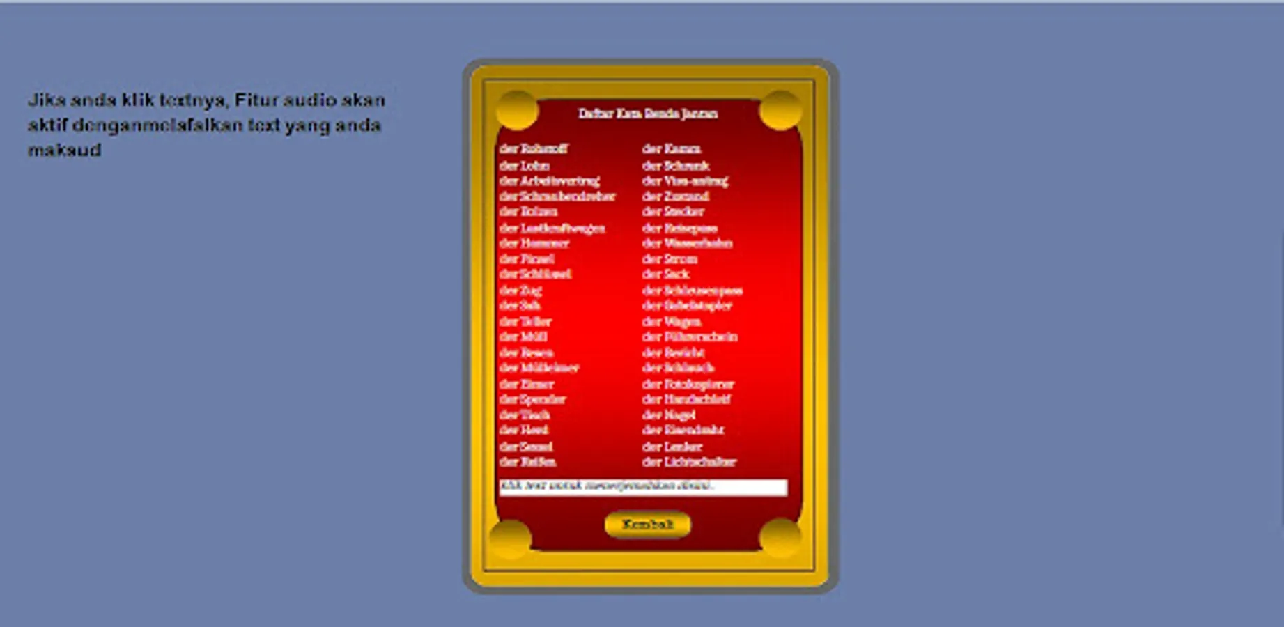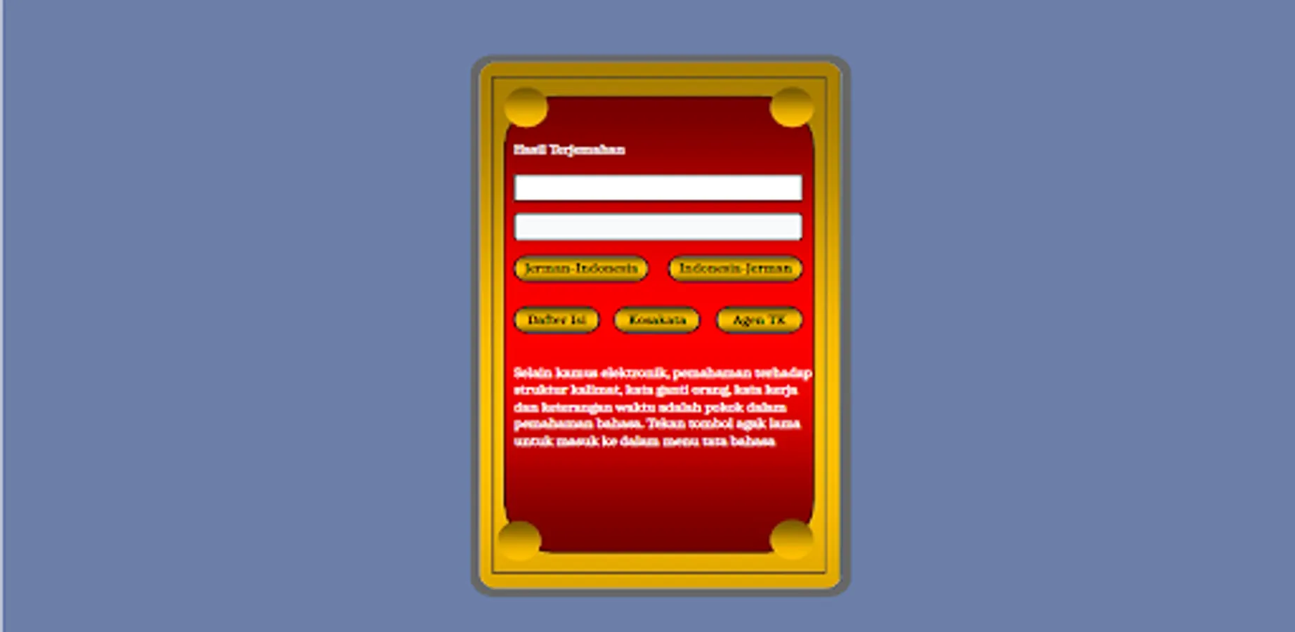 Kamus ini dirancang khusus dengan kosakata kerja terampil bagi yang berminat mencari pekerjaan ke Jerman, Belanda, dan Austria. dilengkap fitur audio listening, kosakata kerja, kata sifat, kata benda, keterangan waktu, rumus2 kalimat dan daftar agen kerja setempat.