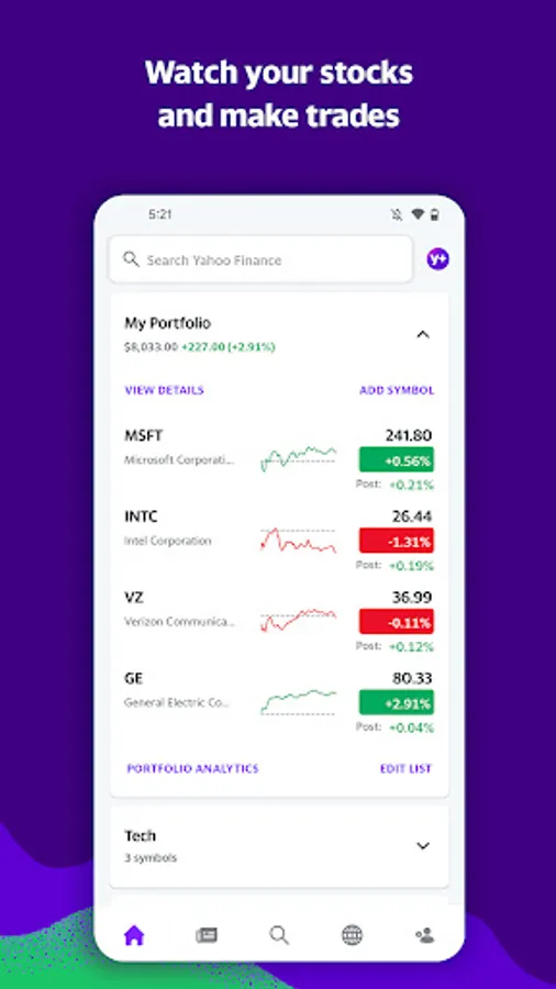 • Link your portfolio to Yahoo Finance and keep tabs of your holdings on the go. See your holding’s daily performance at a glance in the “Home” tab