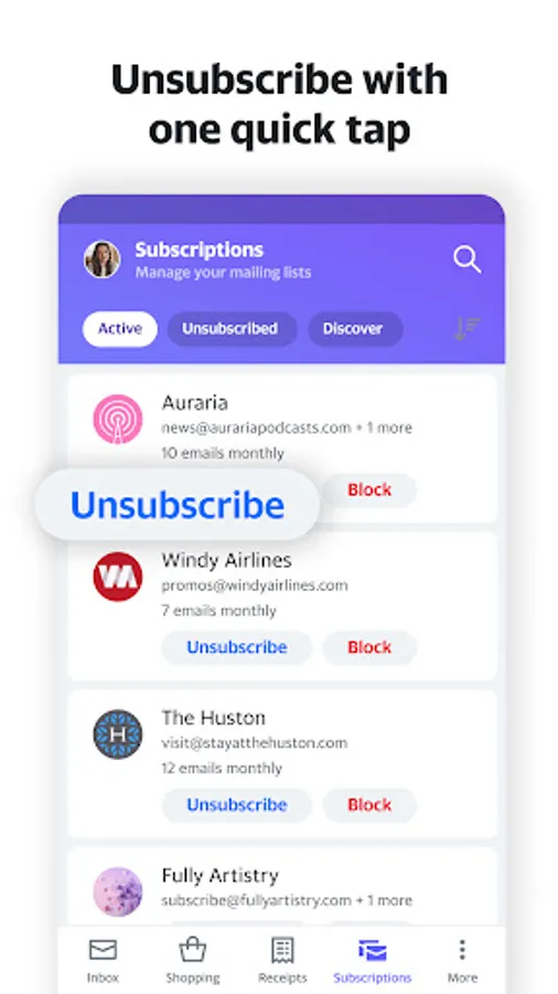 Skip the tiny unsubscribe links at the end of long emails. We organize all your mailing lists in one spot, so it’s easy to unsubscribe from noisy newsletters and promos with a quick tap.