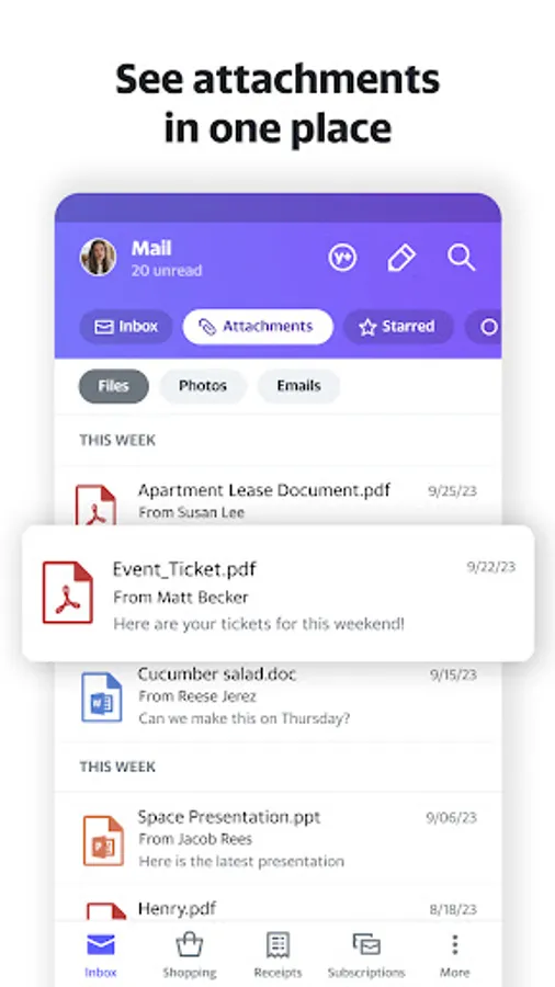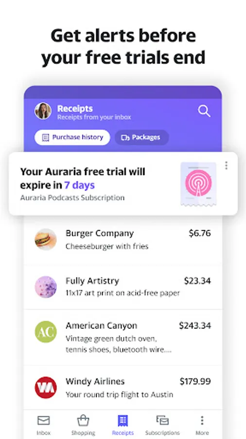 See all your receipts organized in one place so you can easily find the one you're looking for. Digging through receipts from months ago can be a hassle, Yahoo mail app makes this process a breeze.