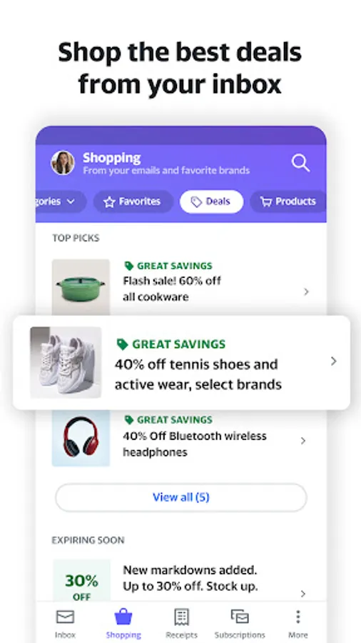 No more searching through countless promotional emails to find those savings. This view organizes your inbox around your favorite stores and the categories you shop. Now, find all your favorite deals—without the clutter. Organize your shopping life and never go back to hunting for that deal again with Yahoo mail app.