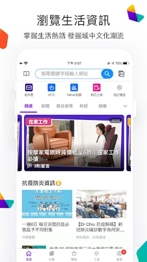 • Check out all major current affairs news, food, drink, entertainment information, discounts and rewards all in one app. Get the latest news and consumer intelligence anytime and anywhere, and gain a comprehensive understanding of social events. You can also check stock prices, trading information, discount codes, lifestyle information, hot topics and Yahoo TV, as well as quickly search, browse frequently used web pages, send and receive e-mails, and shop online!