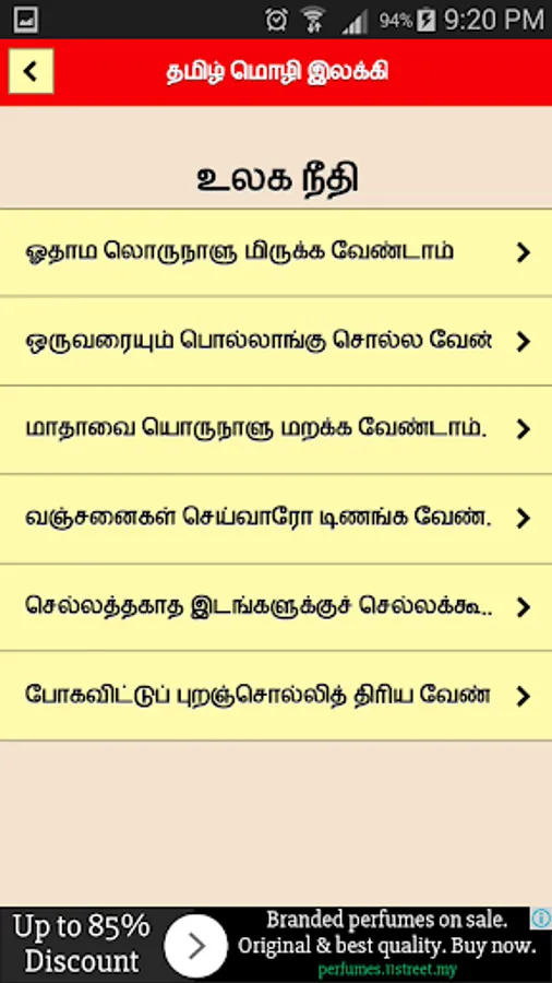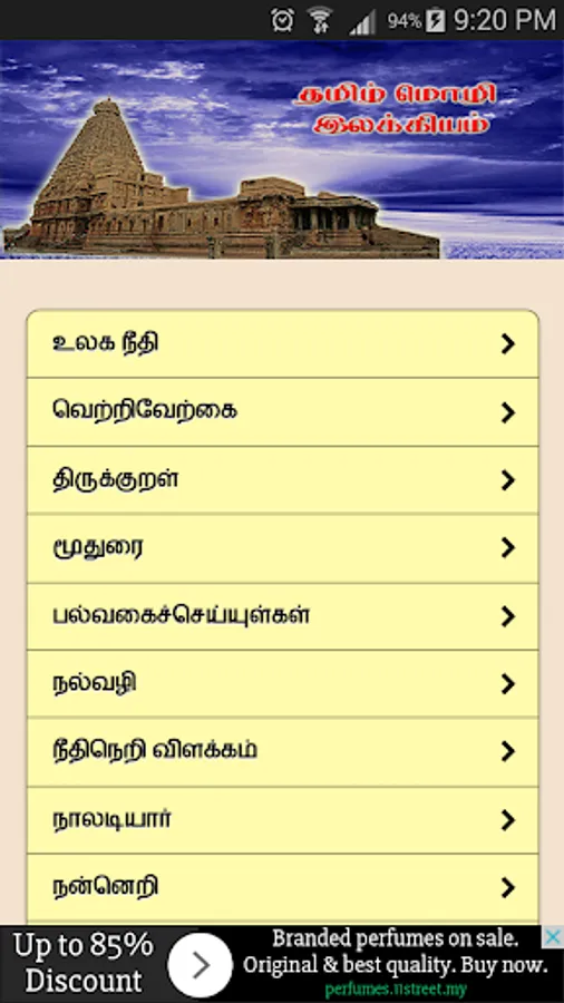 Tamil Ilakkiyam include Ulaga Nithi,Vethri Vekkai,Thirukkural,Muthurai,Palvakai Seyyulkal,Nalvazhi, Nithinerri villakkam,Naladiyar,Nannerri,Inai mozhi,Marapputhodar, Palamozhi