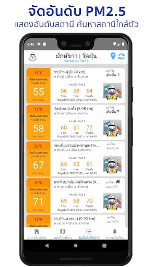 6. Show ranking Of the dust measuring station (School that participated in the project) ready to be able to press to save as a station near the house And can sort stations by distance