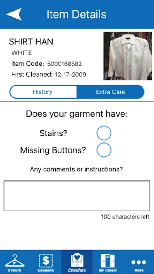 My Closet gives you the ability to harness the power of Yale’s custom bar-code computer system to track your wardrobe. My Closet is a complete list of all garments cleaned on your account. Select any item from the list to view that garment’s cleaning history, request Extra Care Service or attach a garment photo. Garment photos will appear throughout the app helping you identify which item is being referenced.