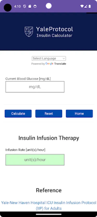Yale New Haven Health Insulin Infusion Protocol (YaleProtocol) is built into an application for use by bedside clinicians. The app helps prevent calculation errors in titrating insulin drips in critically ill patients. Please check with a healthcare professional in addition to using the app before making medical descriptions.