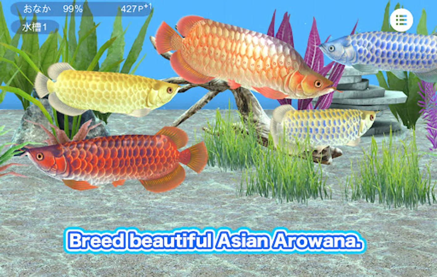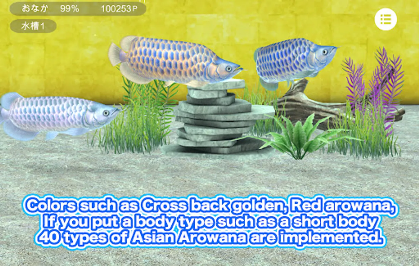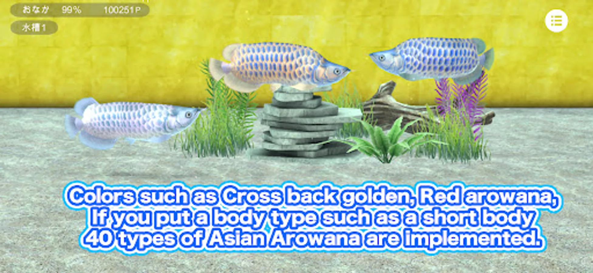 ●You can have 5 aquariums, each with a different layout. You can keep different types of arowana in each aquarium. For example, Red arowana can be collected in a red aquarium to create a red aquarium, or Cross back golden can be collected in a yellow aquarium.You can create golden aquarium, or create your own layout for each aquarium.