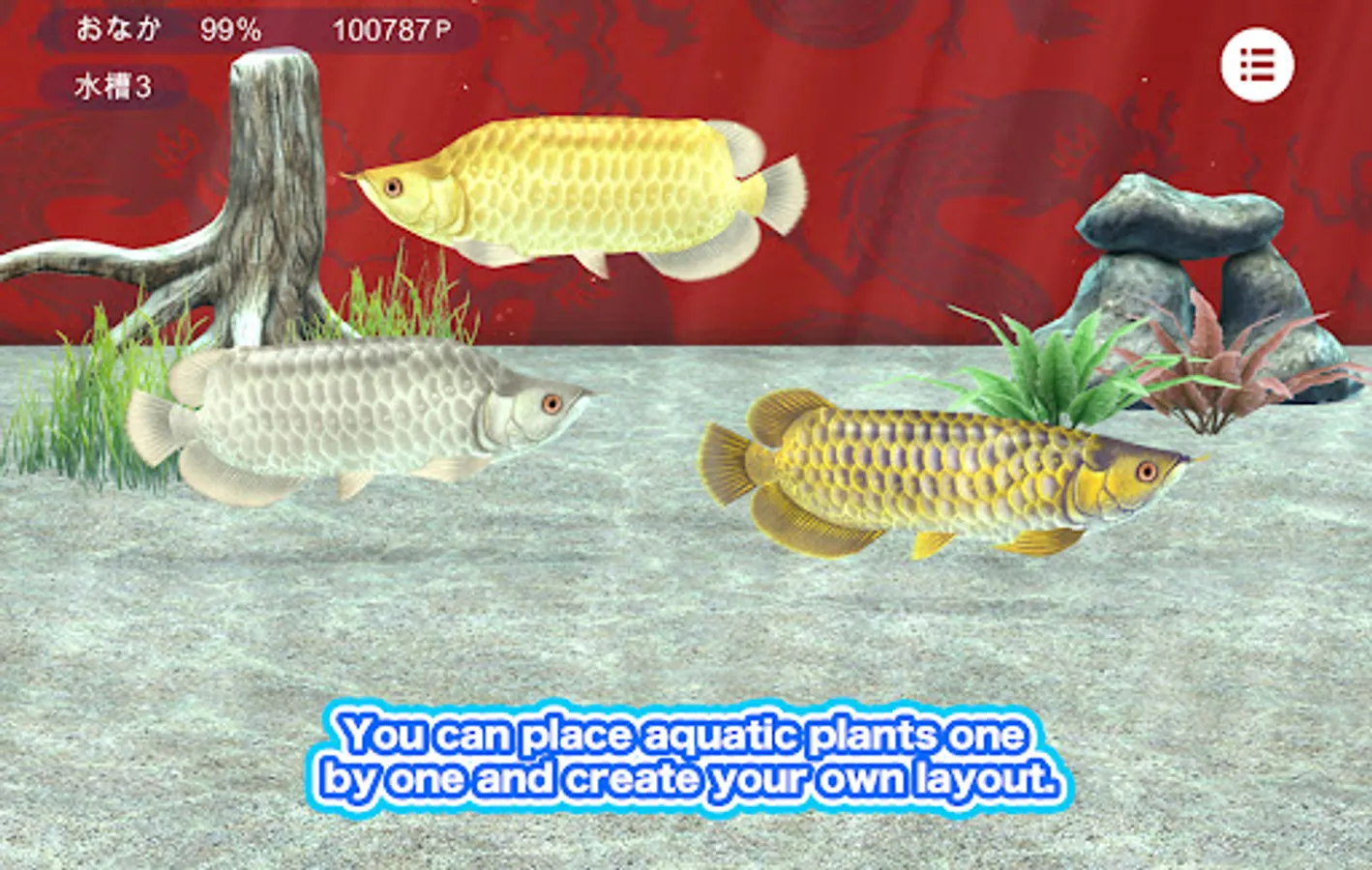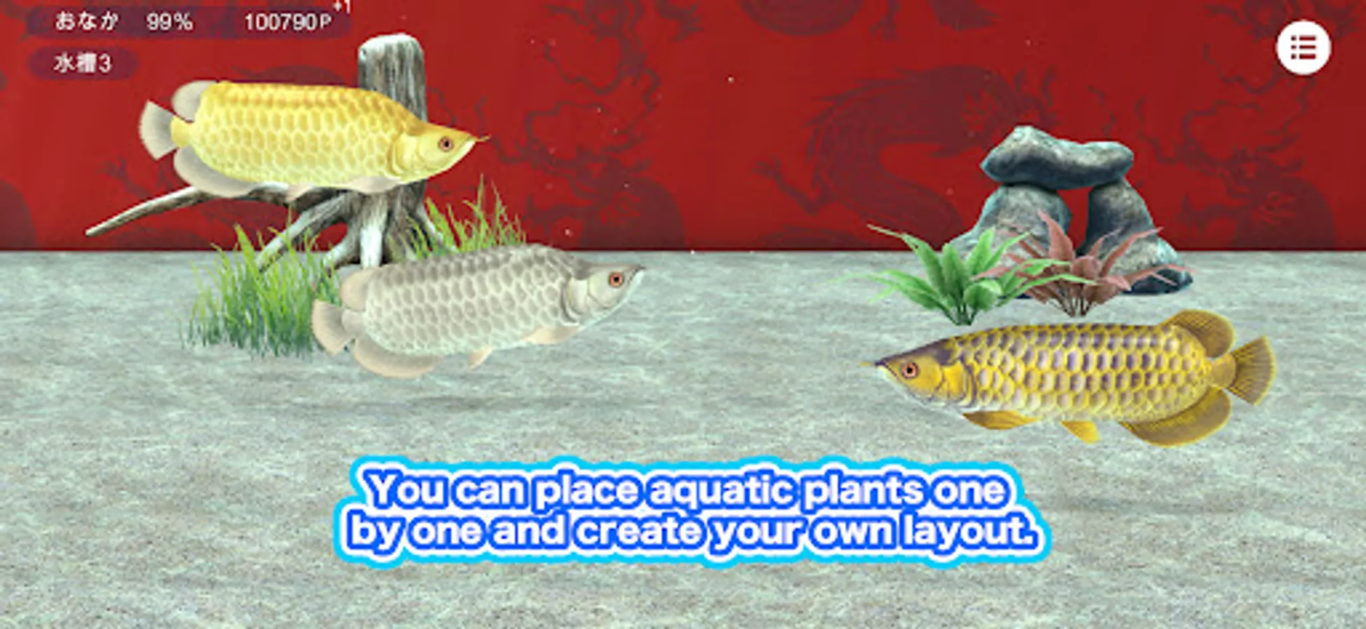 The game gives you food and points. Purchase layouts such as aquatic plants with the points you received, and create your own aquarium.