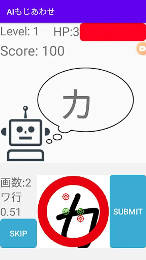 You can get points by writing katakana so that it passes through the target according to the theme (A line, La line).