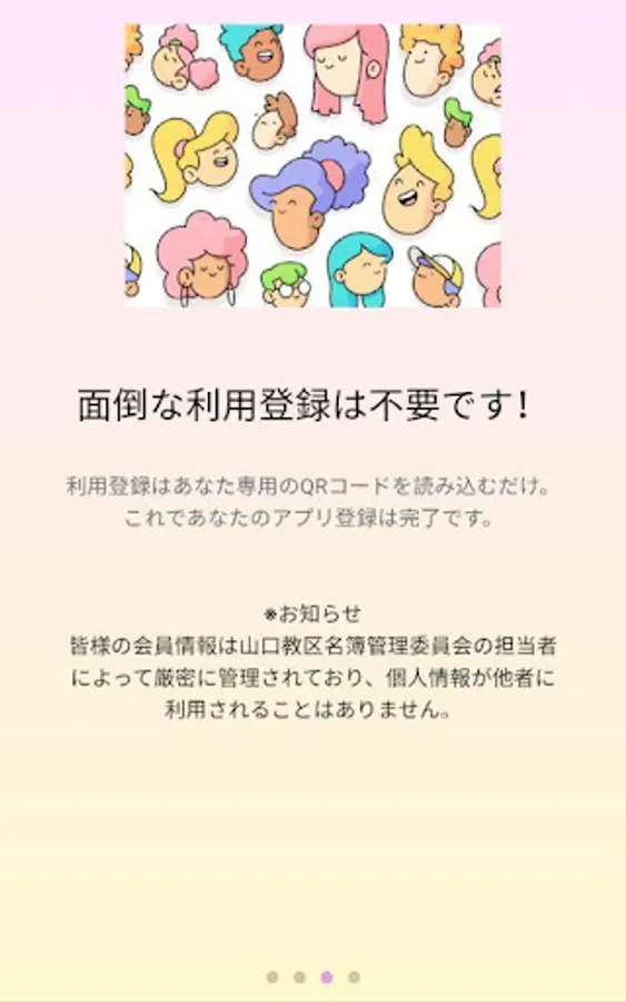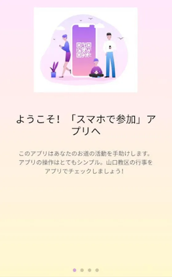 This app will help your road activity. The operation of the application is very simple. Let's check the event of Yamaguchi parish in the app! They also register for church events and confirm attendance. All you have to do is find the church event you want to attend and show your QR code at the venue. You are now registered! No need for troublesome registration! To register, just read your own QR code. Your app registration is now complete.
