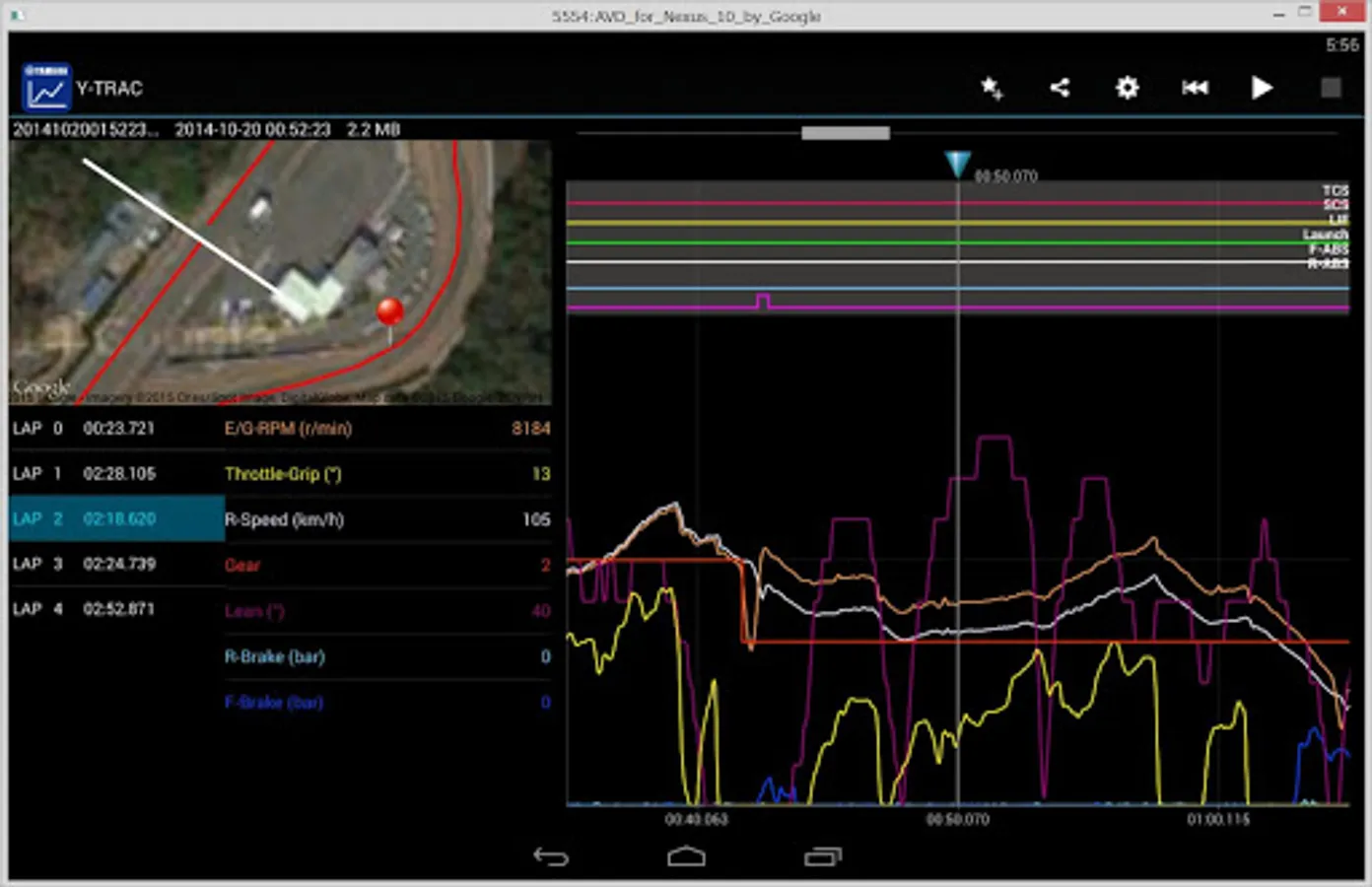 Y-TRAC is a log viewer application for viewing vehicle information collected in the CCU (* 1). Many kinds of vehicle information are displayed visually in an easy-to-understand graph, such as vehicle speed and engine speed, accelerator opening, banking angle and brake pressure, as well as various types of control effects. In addition to vehicle information, position information is recorded simultaneously in the log data stored in the CCU. Due to this synchronization of position information and vehicle condition, you can quickly pick up information such as braking point at corner entry, brake pressure, vehicle speed, line, banking angle at turn, and throttle condition at exit. Since the graph displays each lap, you can easily understand the characteristics of a good line. Find a way to improve your lap time through careful study of the app's features. Circuit racing becomes more and more fun because now you can compare bookmarked data with your competitors.