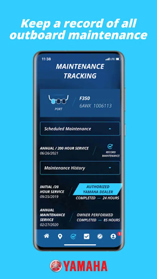 • Tracks all essential outboard maintenance in one convenient place—auto-updating after dealer-completed service interval and allows boaters to manually enter their own DIY maintenance