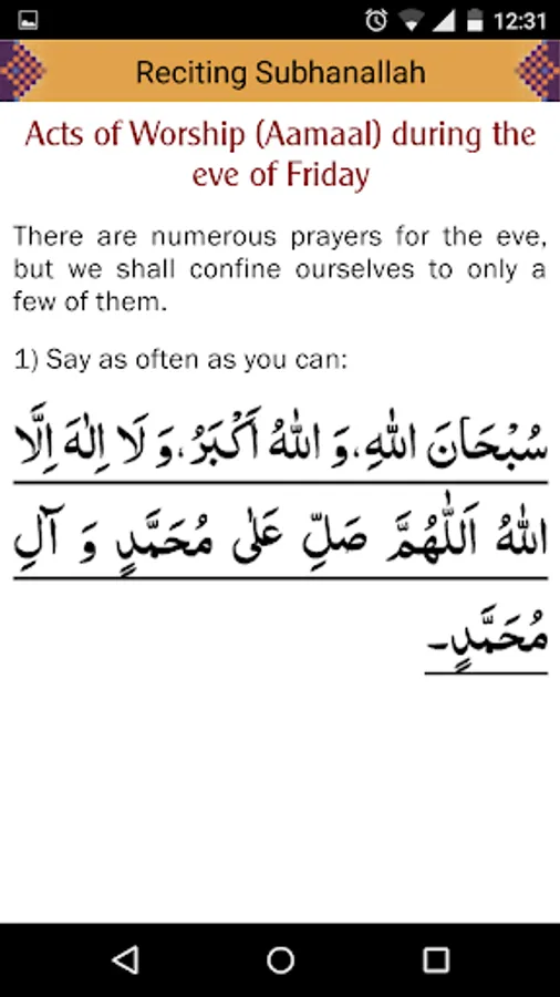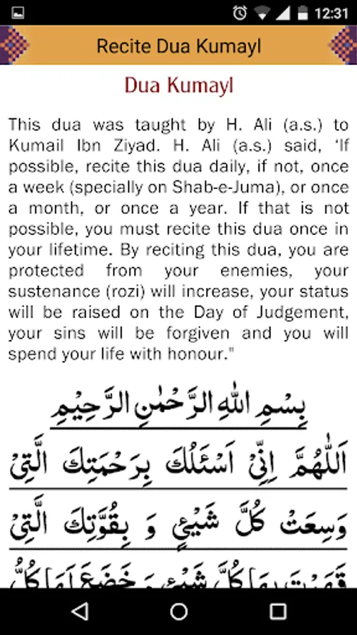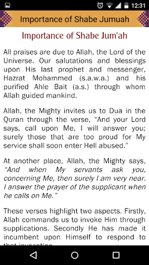 The application in your hand is an endeavor of the Jamaat to spread the correct Shiite way of living. This APP is an adaptation of the book compiled by Jamaat and printed by the name of ‘Aamals of Shabe Jum’ah’. It is compiled from Mafateehul Jinaan. All the aamals have been collected at one place so that it becomes easy to recite.