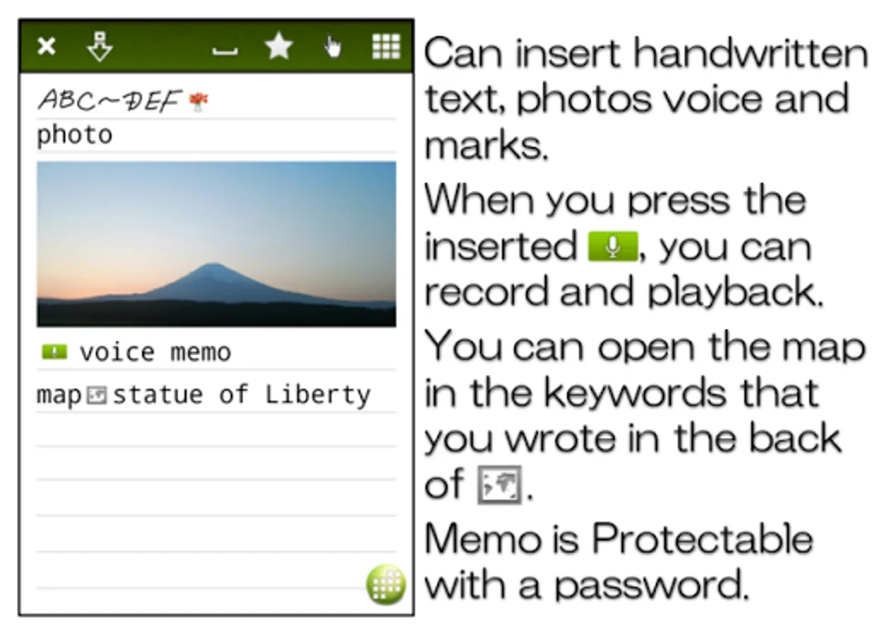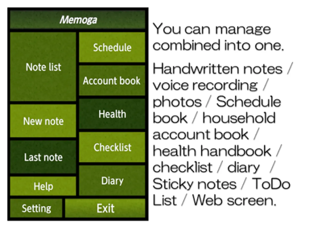 You can manage all of these following things like system notebook: hand-lettered notepad, sound recording, schedule book, a household account book, health record book, checklist, dialy, tag paper, To Do list, web screen recording, and so on.