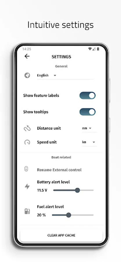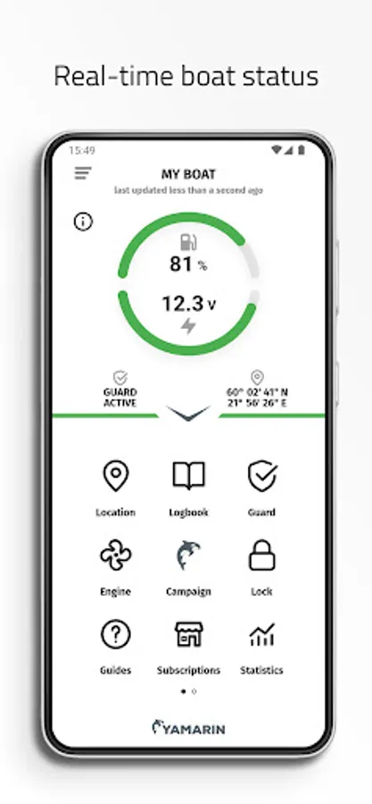 - Boat information shows e.g. fuel level and battery voltage (requires a Yamarin Q device).