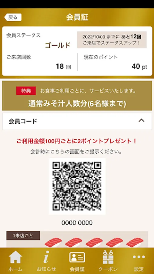 By presenting the membership card (QR code) of the app at the time of payment, points will be awarded according to the amount spent.