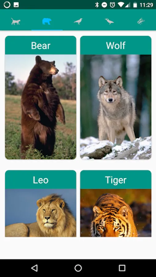 The application is very simple operation. You must select a group in the top tab. A short click on the image of the animal will play a sound, clicking on the text will be pronounced the name of the animal..