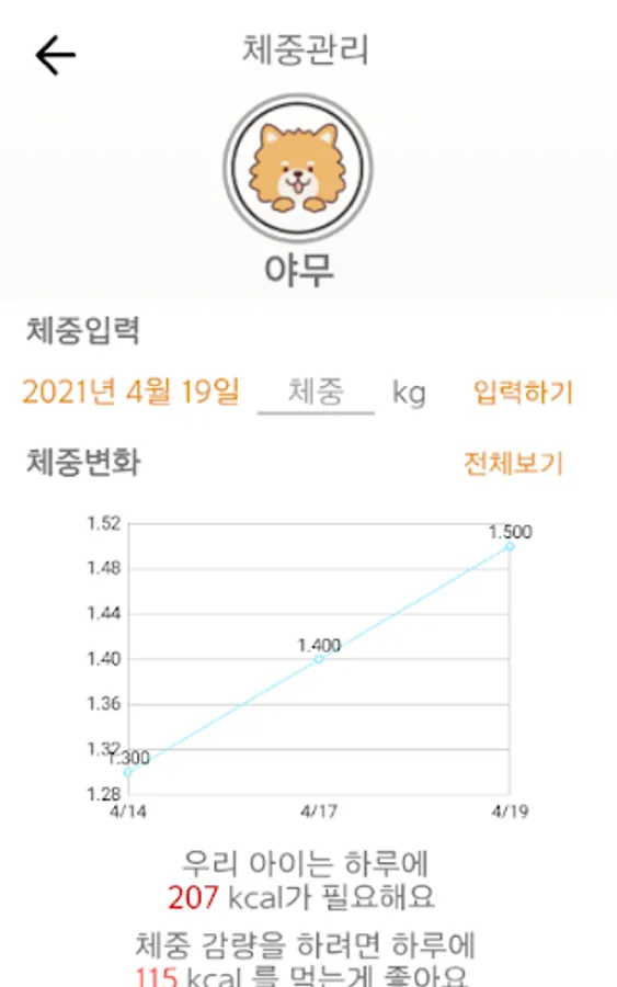 If you enter your weight, the recent 5 records are expressed in a graph, so you can easily see the change pattern, and you can easily calculate how much you need to eat by calculating the appropriate calories according to your weight.
