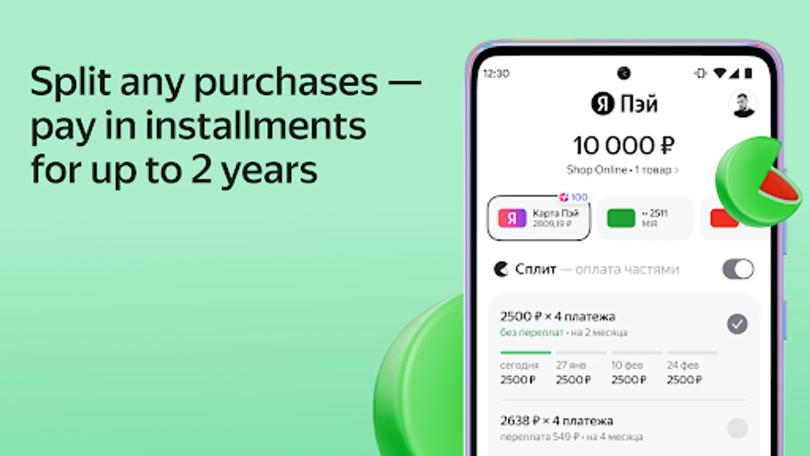 You can also manage your splits in the Yandex Pay app: split payments for your purchases for 2 months (without fees) and up to 2 years — online and offline. Track your payments schedule there as well for better financial planning without missing payments days.