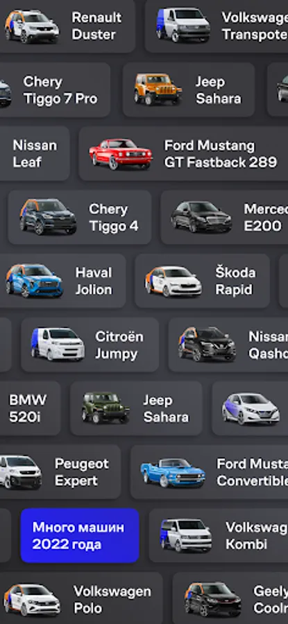 У нас около 18 000 машин 20-ти разных моделей. Есть эконом (Hyundai, KIA, Renault, Škoda, Genesis), бизнес (Audi, Mercedes, BMW), Джипы и электрокары, фургоны и микроавтобусы. Даже Мустанги 60-х годов.