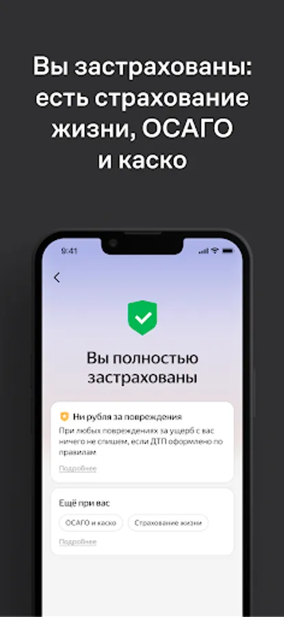 Есть ОСАГО, страхование жизни водителя и пассажиров на 2 000 000 ₽ и каско с франшизой «Виновника». С ней вы не заплатите больше 40 000 ₽ за ущерб обычной машины, 75 000 ₽ за особую и 150 000 ₽ за Джипы. А если взять каско без франшизы, то есть полное покрытие ущерба, то все риски мы возьмём на себя, и при любых повреждениях с вас вообще ничего не спишем, если ДТП оформлено верно. Так что в Драйве вы прикрыты со всех сторон.