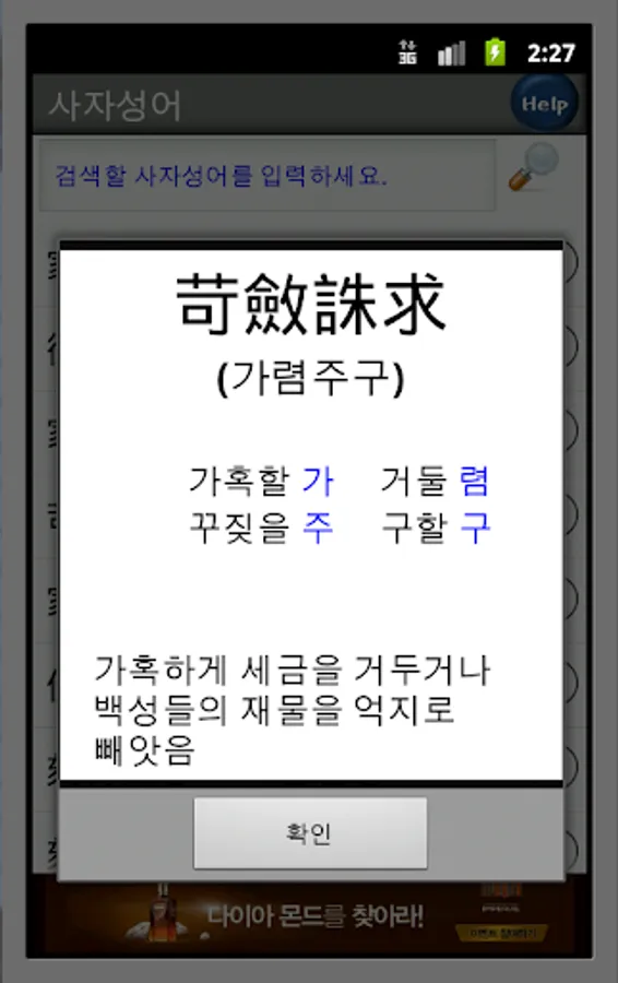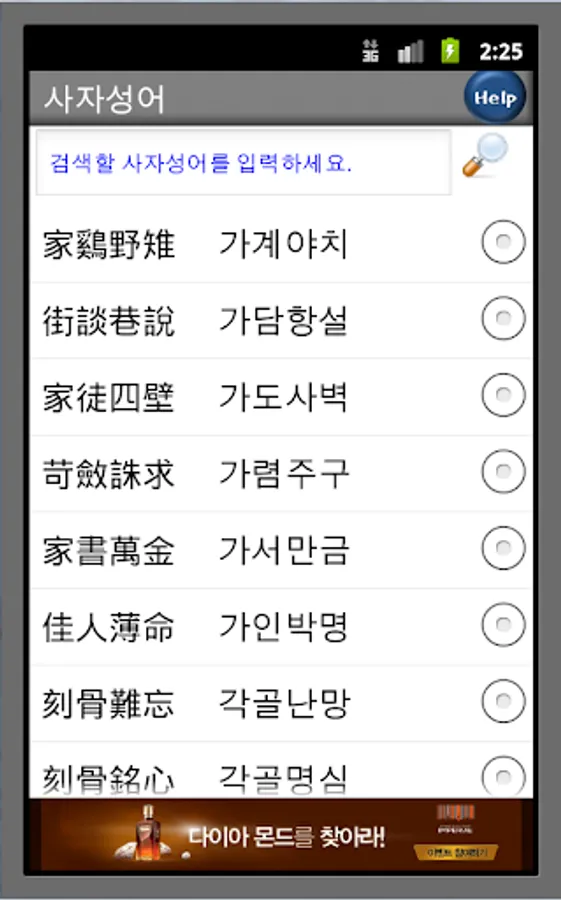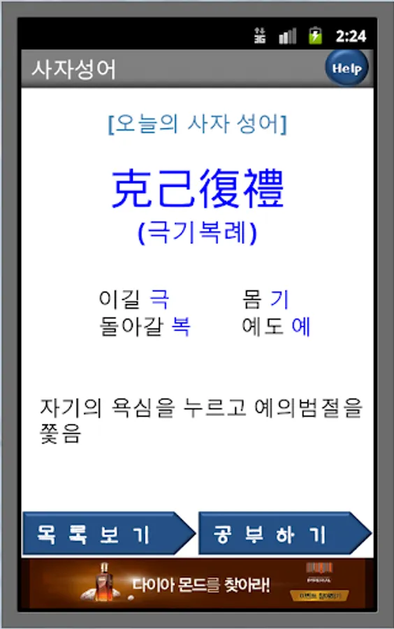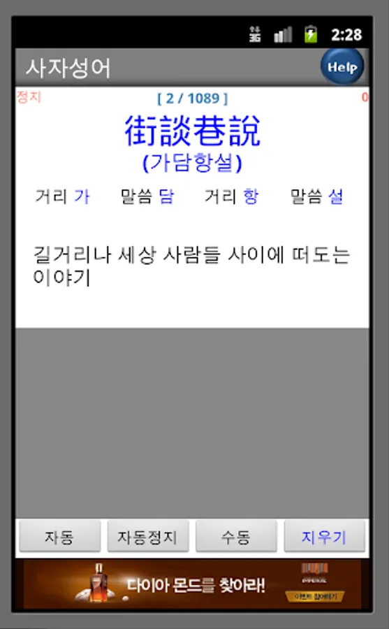1. Four - character idioms of the day shows to choose one at random upon starting the app, like horoscopes of the day.