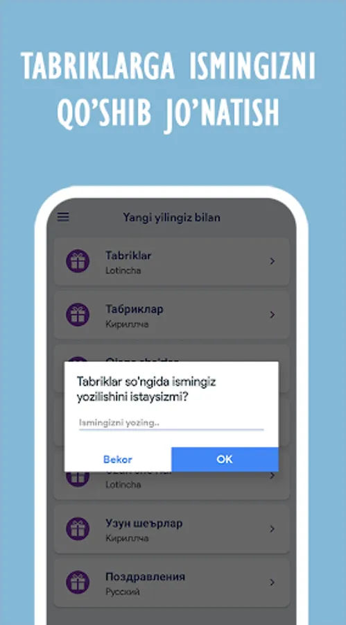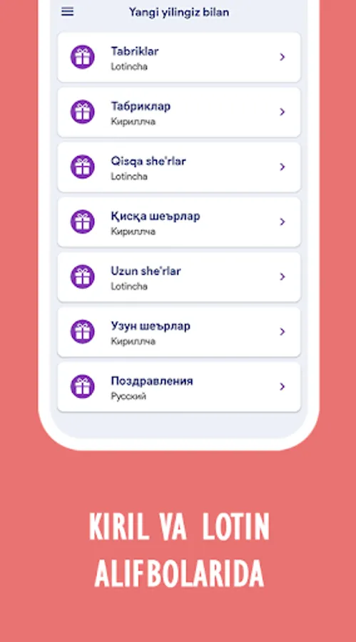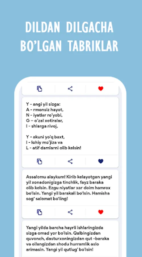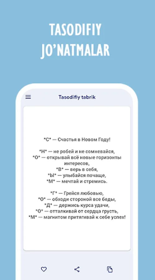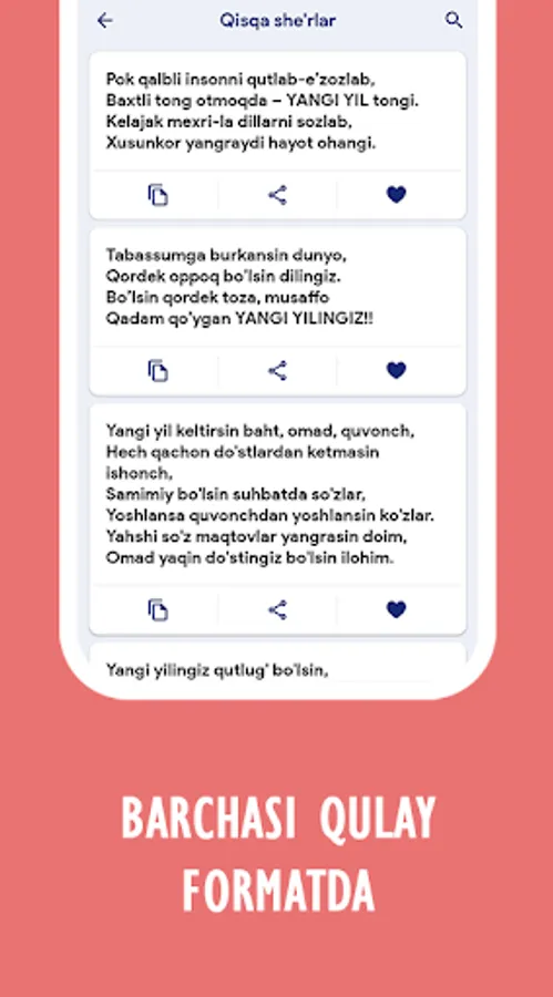 Chin ko'ngildan yozilgan Qisqa va uzun sherlar mavjud bo'lib, soniyalar ichida ularni nusxalashingiz va yaqinlarga, do'stlar va tanishlarga jo'natishingiz mumkin.