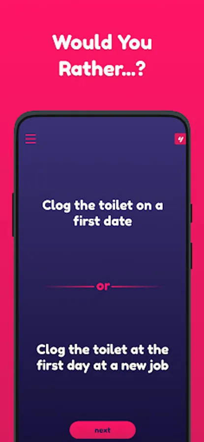 Play through hundreds (350+) of fun, embarrassing, and intriguing questions, and find out which scenarios your friends and close ones prefer! Spice up your parties by making it competitive!