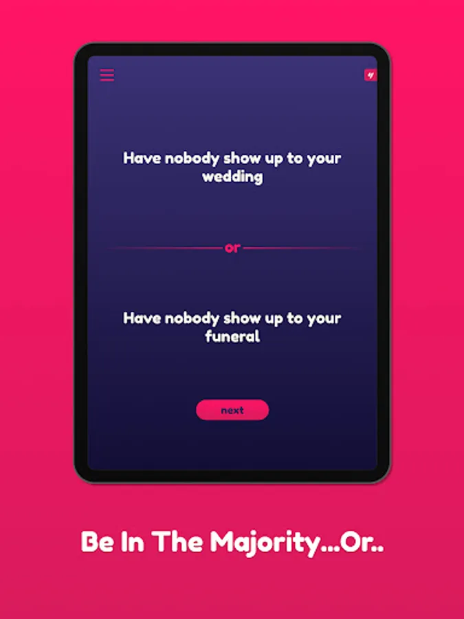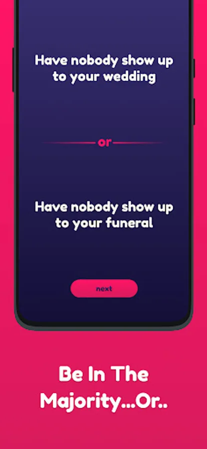 Get a bunch of friends gathered. The app will display two scenarios at the time. Everyone votes for which scenario they prefer, and the ones who vote for the least popular scenario loses!